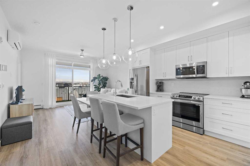 Welcome home to Seton West in Seton! This 700 sq ft UPGRADED two-bed, Two full bath condo is perfect for you. Step into the kitchen boasting thicker quartz countertops, a quartz backsplash, upper cabinets extending to the ceiling, and a dropped-edge eating island. Did we mention the appliances are a fully upgraded stainless steel package with an extended warranty until 2025? The living area is inviting bright and open, complete with a ceiling fan and a balcony featuring a gas line for your BBQ and stunning west facing mountain views. The primary bedroom offers ample space for a restful night's sleep, mountain views and features a 4 piece luxurious ensuite bathroom with upgraded wall tiles, the second bedroom is versatile, suitable for guests, storage, or a work area - the choice is yours! Additional highlights include dimmer switches, pot lights, and beautiful accent lights, Luxury Vinyl Plank Flooring in the main bedroom that extends through the main living area is durable and ready for all life can throw at it. The additional 4 piece main bathroom is great for guests, and the added bonus of AC for those warm summer days. This unit also includes titled underground parking and Assigned storage locker. Seton offers easy access to both Stoney Trail and Deerfoot Trail and this condo is just steps away from Shopping, Grocery Stores, a Movie Theatre, Restaurants and The South Calgary Health Campus. Welcome home to your beautiful Seton condo!