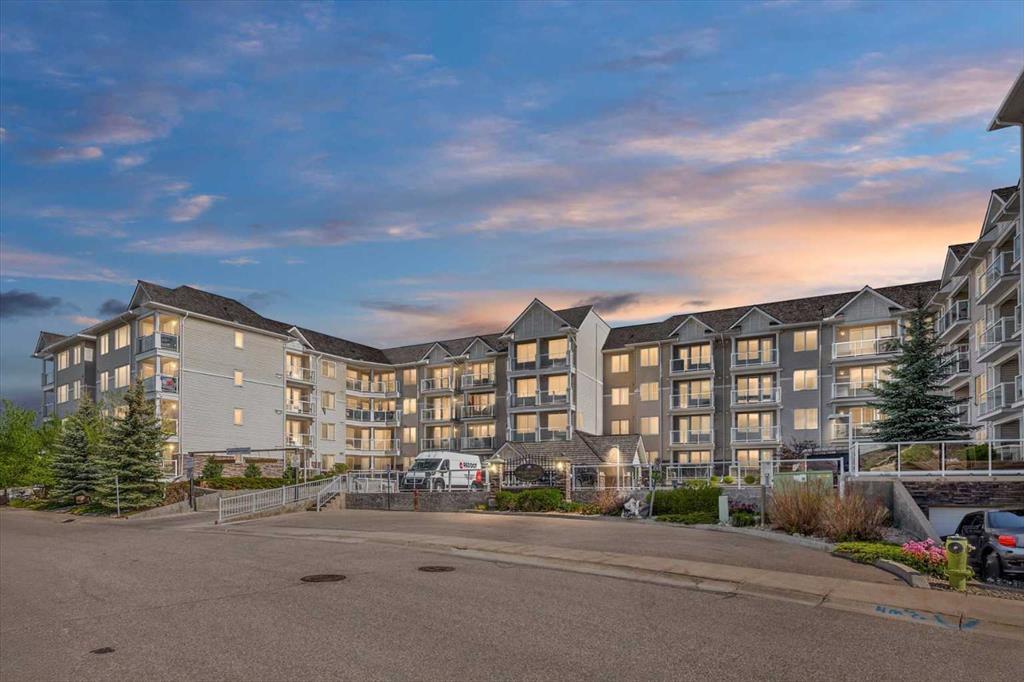 One of the prime TOP-FLOOR 1 bedroom plus DEN units in this complex. PANORAMIC UNOBSTRUCTED SW facing MOUNTAIN VIEWS are all yours with underground secure parking plus storage unit. Contemporary open design, granite counter tops and ceramic tiles in kitchen and bathroom. The Kitchen has chestnut stain birch cabinets, under cabinet lighting with stainless steel appliances including built-in microwave oven. The carpeted living room features natural light streaming through large windows framing the greenery of the Paskapoo Hills and the Rocky Mountains. A balcony hook-up awaits your BBQ. The master bedroom is bright and spacious with a spacious walk-through closet to the 4 pce ensuite. Enjoy the mountain views from bed. All this plus in-suite laundry. An Entertainment room and a fitness room are a convenient elevator ride below on the main floor. Immediate possession. 10 min Walk to the C-train and in proximity to Crowchild Trail and the Ring Road. A Minimal Rocky Ridge Assoc. HOA fee gives access to Rocky Ridge Ranch community center OFFERING a lake, splash-park, boat rental, winter skating, tennis courts, basketball and more. This unit and all appliances show like new. 1 cat or 1 dog allowed - not over 20 pounds.