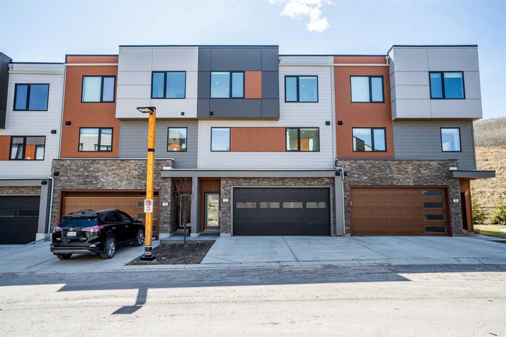 OPEN HOUSE SATURDAY APRIL 27 130PM - 4PM . Welcome to the Village at Trinity Hills in the community of Medicine Hill. Located on the banks of Paskapoo, this townhome has all you need. Shopping, restaurants, fitness centre, playground, grocery stores, the Calgary Farmers Market, and COP just minutes away. And out your back door, acres of pathways to explore on the banks of Paskapoo. The unit itself boasts a double garage with a flex room/gym that you can walk out to your private fenced backyard. The 2nd floor is the main living area with a powder room, a bright kitchen with stainless steel appliances, quartz counter tops, and a huge pantry. Next to the kitchen, a perfect office or computer room. The island has an eating bar and built in cabinets. The open concept is great for entertaining with a dining area and living room which you can exit and enjoy your sunny south backing balcony with privacy glass where you can relax and take in the quiet green space and watch nature as the wildlife comes for a visit now and again. There is also a gas hook up for the barbecue. On the 3rd level, you have two spacious bedrooms. Both which could be considered as primary. They both have a 4pc bath with one having a walk in closet and the other having his/hers closet space with a den. This unit is sure to please. Call today and avoid missing out!