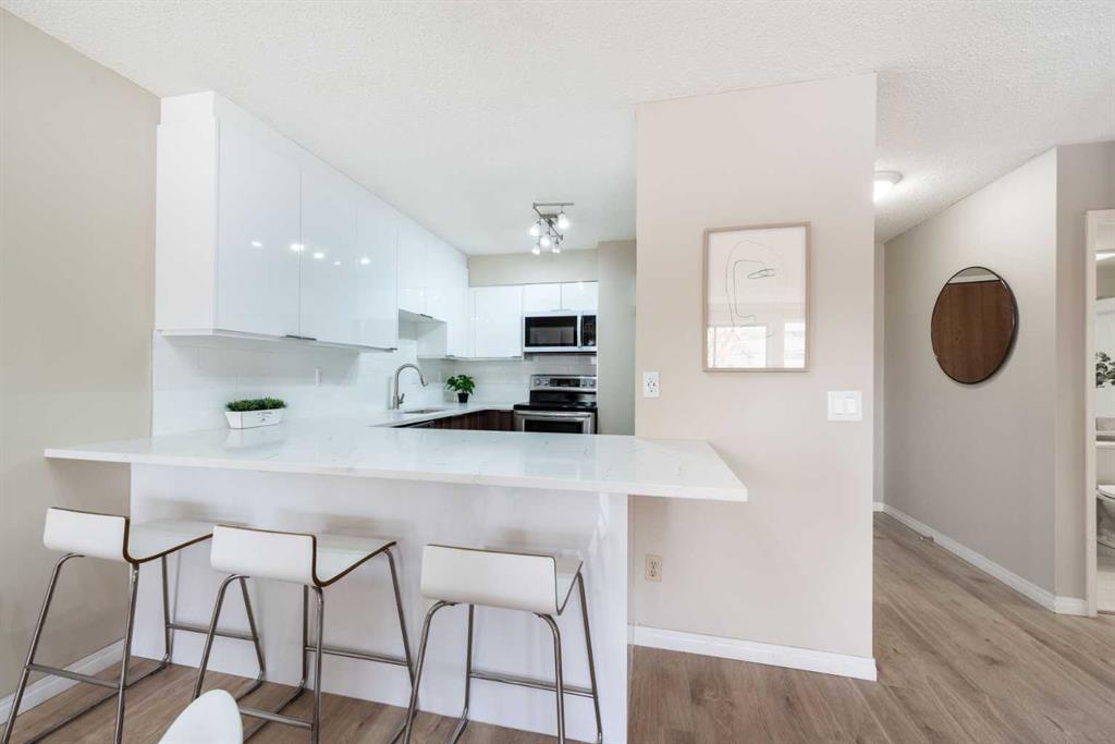 Indulge in the charm of this beautifully renovated corner 2-bedroom condo, nestled within a quiet concrete building. As you step inside, you will be greeted with the bright and openness of this over 970 sqft modern living space. The kitchen itself is a sight to behold, boasting custom glossy white and brown cabinetry, quartz countertops, and a shiny white subway tile backsplash. It's equipped with deep dual sinks, a trendy pull-out tap, and stainless steel appliances. The living room offers ample space for various furniture arrangements and boasts full-width windows that provide ample natural sunlight. Throughout most of the unit, you'll find laminate plank floors, adding a touch of elegance. The primary bedroom is a peaceful retreat, featuring a completely renovated 2 pc ensuite and a walk-in closet. Nearby, you'll find a convenient laundry/storage room with a stacked washer and dryer.