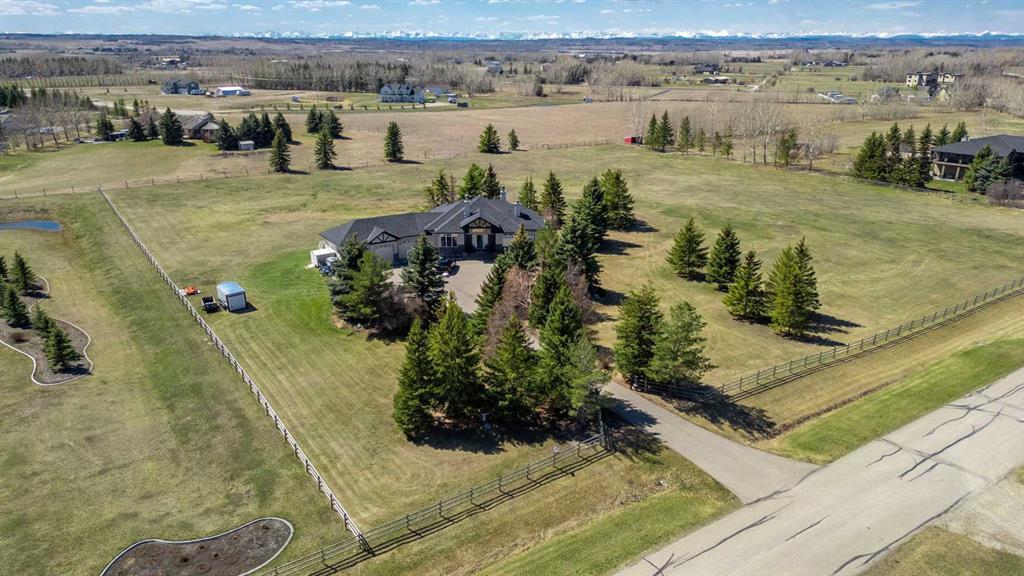 Introducing a meticulously maintained, custom built, walkout bungalow with 3926 sq ft of developed space and nestled on almost 5 acres of serene landscape. This 4-bedroom, 4-bath room residence offers comfort and sophistication. Featuring an open floor plan where dining room leads in to living room and kitchen. As you enter you will notice the soaring ceilings and walls of windows-over 80 windows. This home was strategically positioned to maximize sunlight all day long and enjoying the mountain views. The stone, wood burning fireplace is the focal point of the space and is enhanced with custom built-ins. Enjoy an extended island with raised eating bar in the stylish, recently renovated kitchen. Granite counters, stunning custom built Alderwood cabinets, pantry, wine rack and high end appliances adorn the space. The kitchen is enhanced by a beautiful tin like ceiling. Step outside from the nook on to the raised deck and enjoy the incredible views and the peace and quiet of country living. This wrap around deck has newer dura-deck and electronic sun shade. Beside the front door is a cozy den with wood burning fireplace, built-ins and views of downtown Calgary. The spacious primary bedroom boasts a door to the deck , large walk in closet and a spa-like ensuite. The ensuite sports a dual vanity, a jetted tub for relaxing and sperate shower. The lower level is the perfect space for entertaining or for extended family. The 9 ft ceilings, in-floor heating and three sided fireplace, ensures year-round comfort. With both the outside door to the lower deck as well as another exit to the garage the lower level could easily be another living space. Two bedrooms, 2.5 baths and home office (possible bedroom) can be found in the lower level. A huge rec room including wet bar that leads into a functional wine room with dishwasher and fridge. Step through the doors to the outdoor paradise surrounded by mature trees. While outside, enjoy the perfect entertainment space with stone patio, gas fire pit with log lighter, hot tub and integrated sound system that plays inside and out. The attached triple garage benefits from in-floor heating, keeping vehicles warm in winter. and plenty of land space for a future shop! There is a separate approach ready for access to a future outbuilding. Located just southeast of Calgary, this home offers a peaceful retreat just a short drive from the city. Experience the charm of this custom home and make it yours.