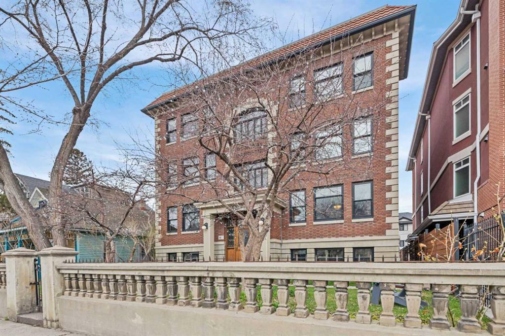Welcome to the Donegal Mansions! Overlooking the Bow River, steps to the Peace Bridge and Kensington shopping district this is a prime Sunnyside location. Significantly renovated in 2002, this historic building has managed to preserve many original features. Beautiful natural light floods the South facing living areas. The original casings, moldings and fireplace have been preserved. Built in book shelves with leaded glass doors demarcate the large open living room and dining room. Leaded glass bi-fold doors open to a den/flex space. Add a bed and this would make a great guest space! Large living room windows allow you to enjoy the tree canopy in the warmer months or downtown views in the Fall and Winter. The kitchen is a modern space with lots of storage, stainless appliances, breakfast bar and granite counters. The 4 piece bath has also been renovated. The master bedroom is a peaceful retreat that easily holds a king bed. A serene beautiful space in a secure building in an amazing location!