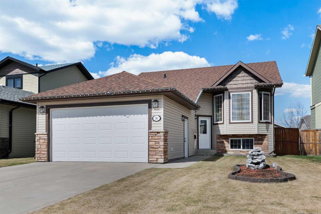 Welcome to 35 Camille Gate in Blackfalds, Alberta! Nestled in a convenient location close to amenities, this home offers comfortable living with a welcoming atmosphere. As you step inside, you're greeted by inviting vaulted ceilings that amplify the sense of space, coupled with ample natural light streaming through large windows at the front of the house. The main level boasts a seamless flow, with a generously sized living room that effortlessly transitions into the kitchen and dining area. The kitchen is practical and functional, featuring plenty of cabinets for storage and a convenient corner pantry. On the main level, you'll find two bedrooms, including the primary suite complete with a full 4-piece ensuite for added convenience. Heading downstairs, you'll discover a spacious family room area that could also serve as a games room, perfect for gathering and relaxation. The basement additionally houses two well-proportioned bedrooms and a three-piece bathroom with a custom tile shower. Outside, the backyard offers a great size and features low-maintenance vinyl fencing, providing a private space to enjoy outdoor activities. The property also includes a double attached garage, adding further convenience. This home is ideally situated just blocks away from shopping centers, gas stations, and a grocery store, with the Blackfalds Abbey Center just minutes away. Recent updates to the home include new basement flooring, bathroom enhancements, updated baseboards, and fresh paint throughout, ensuring a modern touch. 35 Camille Gate presents a wonderful opportunity for comfortable living in a convenient location, offering practicality and functionality without pretense. Along with all those nice upgrades, this home also has an osmosis water system and Rainbird In ground sprinklers for the yard.