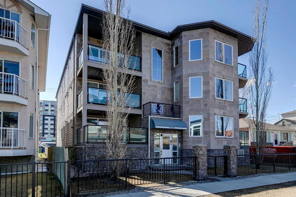 TOP FLOOR CORNER UNIT – SOLID CONCRETE CONSTRUCTION. Small self-managed & well-maintained building with underground parking. Over 1150 sq. ft. of top-quality finishing in this immaculate spacious & bright 3 bdrm, 2 bath condo with 9 ft ceilings, 2 balconies, gorgeous hardwood & tile flooring plus granite countertops throughout! Very open floor plan featuring a good-sized foyer, large kitchen with extended height custom cabinetry & wide-open living room/dining room with access to a private balcony. Two good sized bedrooms plus a large den with double French doors (could easily be a 3rd bedroom) King size master with large walk-through closet & spa like 4-piece bath with soaker tub & pedestal sink & a private balcony with sunny south exposure. This level also includes a 2nd 4-piece bath, a separate laundry room & a furnace room with additional storage. Prime location close to restaurants, SAIT & transit plus easy access to downtown. A fabulous place to call home or an excellent opportunity for investment.