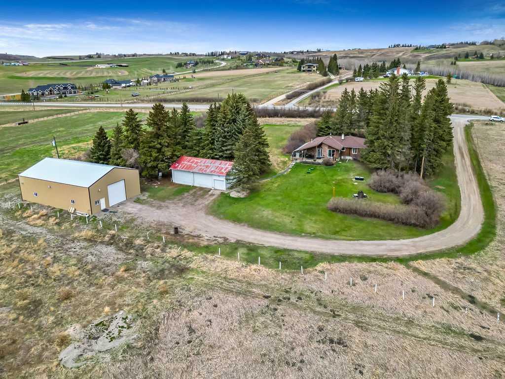 Welcome to this private 3 bedroom home with an oversized triple detached garage and a huge 60' x 40' shop. This home faces South overlooking farm land and has no neighbours in direct sight of the home. Upgrading has been done to modernize this home and bring a contemporary feel. Situated just minutes from Calgary city limits, Spruce Meadows and Sicrcco golf club, this home is a perfect blend of country living with access to all the city amenities. The house is set in amongst a treed yard and has room for kids to play. There is a large front deck and entry to the home provides access to the kitchen and guest bathroom, kitchen appliances have been updated. Enter to the main living room which includes a feature fireplace. The main floor has 3 bedrooms and 2 bathrooms, plenty of space for a couple or growing family. The property water is well fed and has septic tank and field. The basement is undeveloped and provides great storage or option for future development.