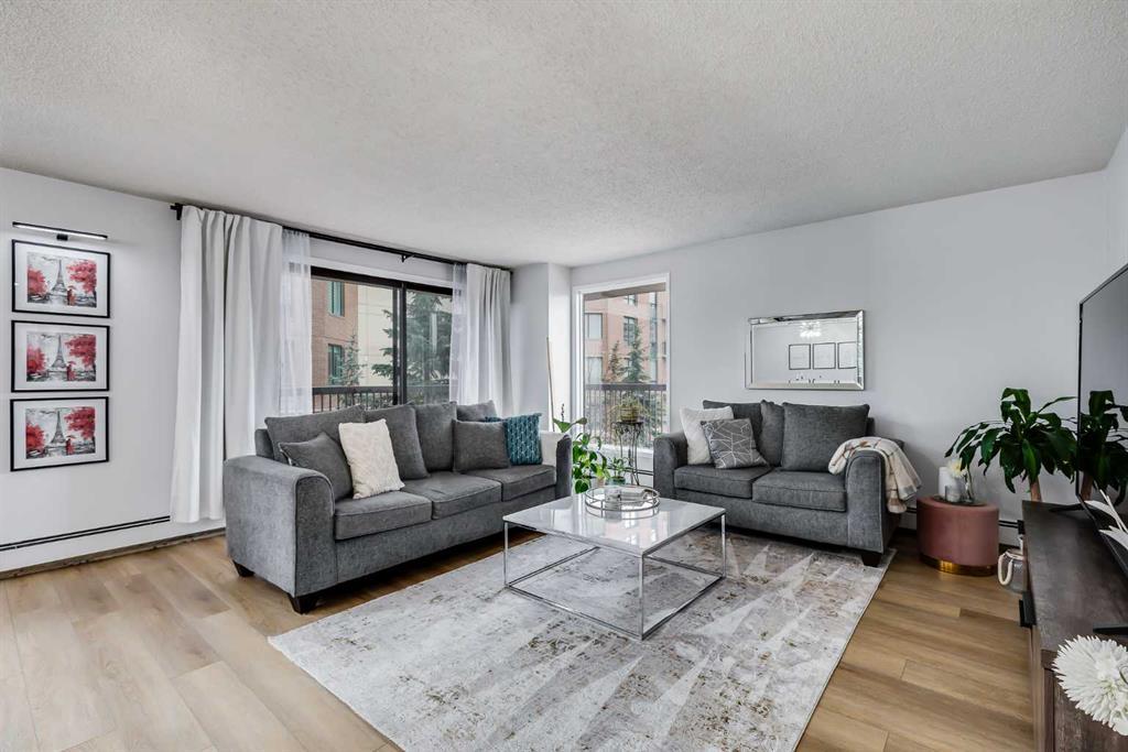 Experience urban living at its finest in this bright and modern corner unit located in the vibrant community of Mission. Spanning 1,084 square feet, this residence boasts 2 bedrooms and 2 full bathrooms, offering a comfortable and contemporary living space. Upon entering, you are greeted by an open concept layout seamlessly integrating the kitchen, living, and dining areas. Luxury vinyl plank flooring flows throughout, complementing the sleek aesthetic. The large kitchen is a chef's delight, featuring stainless steel appliances, quartz countertops, ample cupboard space, and a convenient breakfast bar. Rich cabinetry adds a touch of sophistication to the space, while a spacious dining area provides the perfect setting for hosting gatherings. The living room is bathed in natural light, thanks to an abundance of windows. Retreat to the expansive primary bedroom, complete with a walk-through closet and a luxurious 4-piece ensuite bathroom. The additional bedroom offers versatility, ideal for use as a home office or den, accompanied by another well-appointed 4-piece bathroom. Convenience is key with and in-suite laundry and storage room. Step outside onto the large wrap-around balcony, offering a covered oasis to relax and enjoy stunning views of downtown Calgary. This tastefully designed unit comes equipped with upgraded light fixtures and condo fees include heat, water and sewer. Secure heated underground parking is provided, along with a deep cubby-style storage locker for added convenience. The Riverscape Building boasts exceptional amenities, including a fitness center and a peaceful park/courtyard with picnic tables. The building's close proximity to the Elbow River and bike/walking pathways provides ample opportunities for outdoor recreation. Mission is an eclectic inner-city community known for its diverse mix of groceries, shops, and restaurants. Explore nearby 17th Ave or take a leisurely stroll to work downtown, with easy access to the LRT, MNP Centre, and Stampede Park. Cats are welcome with board approval.