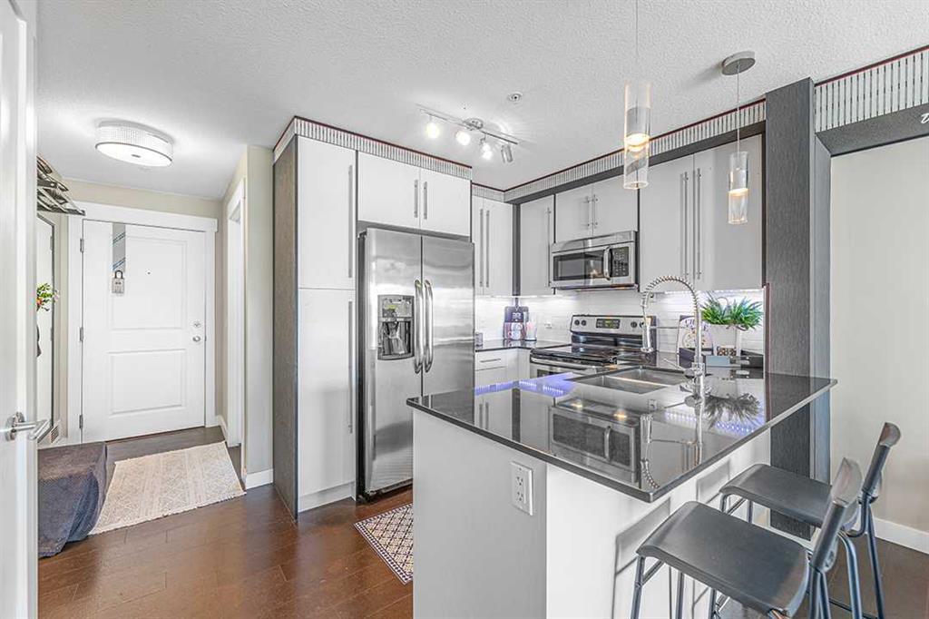 Welcome to this immaculate and cozy home with 2 bedrooms,1 full bath, and a heated & titled underground parking stall located in one of the most fast-developing communities in the South of Calgary. This unit is facing south with a huge balcony for enjoying the view. The sunny living room is open to the chef's kitchen which is equipped with tons of cabinets, granite counters, an eating bar, and s/s appliances. The south-facing primary bedroom is very bright and has a large closet. The second bedroom is in good size and with its own closet. The balcony offers you a relaxing place to enjoy your coffee in the morning. The underground parking plus the caged storage locker will increase your convenience of life. This complex is just steps away from the amenities Mahogany Village can offer and the West Beach. The lake community offers lake access, sandy beaches, pedal boats, a beach club, and more. Own your home and start the lake-living lifestyle now. Don’t forget the 3D tour link for you to explore more about this gem.