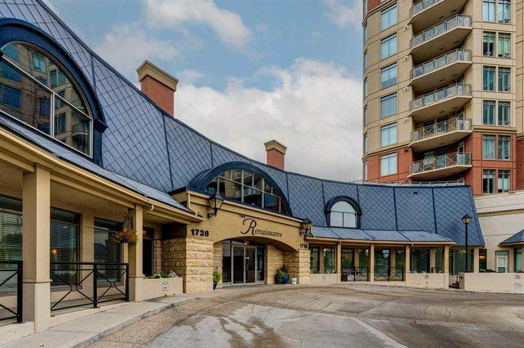 Experience elegant living at THE RENAISSANCE -West Tower . This bright, well-maintained unit boasts a show-suite aesthetic, features A/C, gleaming hardwood flooring, carpeted bedrooms, maple kitchen cabinets and granite counters. The living room and workspace have upgraded built-in with matching bookshelves and desk, enhancing its utility. The second bedroom is equipped with a Murphy bed, maximizing the usable space for your convenience. Indulge in luxury with a walk-in Hydra-Therapy tub, and large ensuite offering both comfort and relaxation. Step outside onto the south facing patio/walk around garden-terrace, reminiscent of a backyard oasis, complete with grass, and a gas hook-up for your BBQ. The garden terrace has a Gazebo seating area, creating a tranquil park-like ambiance. You enjoy the privacy of an end unit while soaking in the south and east views of the city skyline. Enjoy the convenience of (2) titled indoor parking stalls and an oversized storage room. A large private storage unit is adjacent to your parking. The building offers an array of amenities including a full-time concierge, guest suites. fitness facility, party room, private theatre, and games room. Enjoy direct indoor elevator access to North Hill Shopping Centre and effortless transit connections with an LRT station literally at the front door! Nearby, the Louise Riley Public Library beckons book lovers and the Jubilee auditorium is a short walk away. This residence offers a truly magnificent lifestyle, combining luxury, comfort, and convenience in one remarkable package. The Renaissance is an adult 18 plus building. **NO DOGS ALLOWED** 2 Cats or 2 Birds. Parking stalls 342 & 353. Unit is actually on the 2nd floor, not ground level but actually has a large grassed yard & Patio/Terrace!