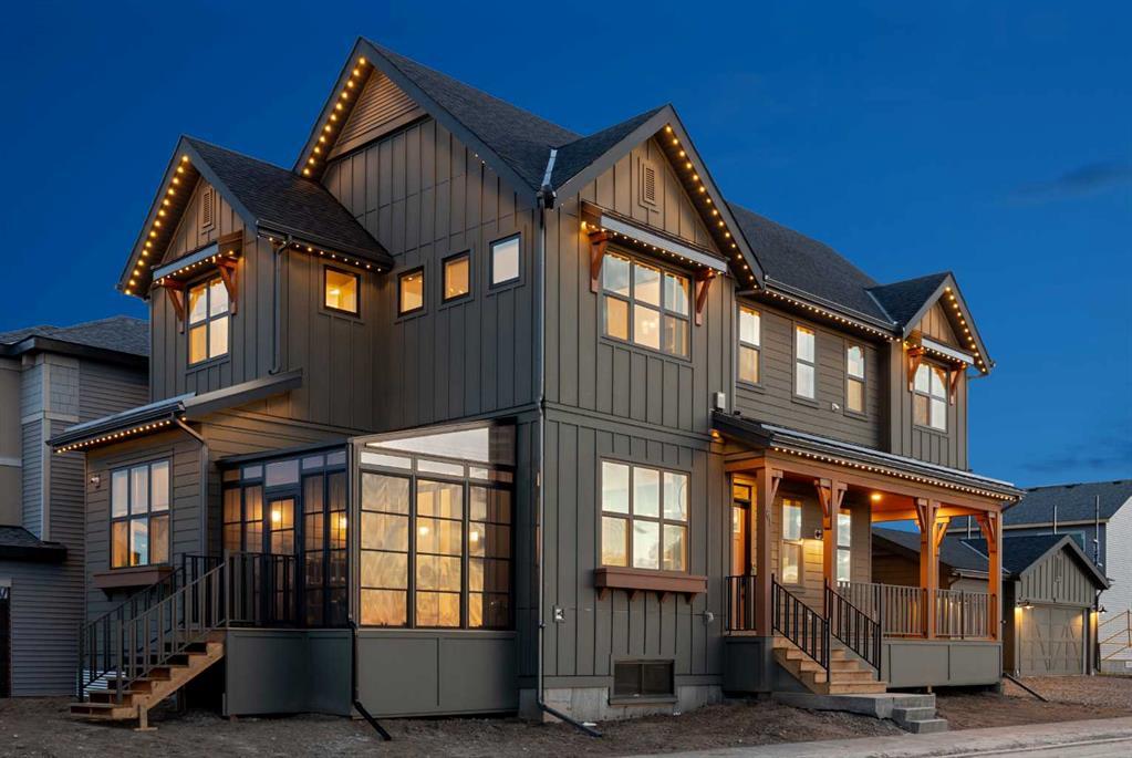 OPEN HOUSE CANCELLED | A once in a lifetime opportunity to own this expertly crafted and artfully curated fully furnished NEW home in the coveted community of Rangeview – Calgary’s first farm to table community. Featuring over $200K in upgrades and the only triple car garage and three season room in the community, this home is unmatched and irreplaceable. Striking curb appeal greets you from this oversized corner lot with modern farmhouse design and full Hardie-board exterior with custom wood and metal accents. Gemstone exterior lighting illuminates the home’s timeless architectural peaks. The front porch welcomes you to the inviting and professionally designed interior. 10-foot ceilings accentuate the open floorplan and draw you in to the chef’s kitchen with high-end Fulgor – Milano appliances and custom built-ins throughout. A large island with quartz countertops features a farmhouse apron sink with wand faucet and built-in pet station. A gas range with custom hood fan, matching quartz slab backsplash and wall oven round out this impressive kitchen. True to the essence of the community the walkthrough pantry/ mudroom area features a fridge specifically for cultivating herbs and spices. Entertaining is a dream from the adjoining dining room with custom drapery and access through sliding doors to a BBQ area on the front porch. Through the living room you can access a unique 3 season sunroom to enjoy long summer nights in Calgary. Rounding out the main floor is a fourth bedroom (currently designed as a gym) and a 3-piece bath with vertical stacked zellige tile, 10 mil glass shower and designer wallpaper. Luxury Vinyl Plank floors are featured throughout the main level and extend upstairs. A custom built-in library/ office nook introduces the second level with 3 bedrooms, a family room, 2 full bathrooms and 10-foot ceilings. The bright primary bedroom retreat is an oasis with coffered ceilings, 44inch built-in fireplace and windows on two sides. The spa-like ensuite has a beautiful standalone tub complemented by an enclosed glass rainfall shower, dual vanities, and a massive walk-in closet with floor to ceiling built-ins by California Closets. The bright upper family room features a beverage fridge and wet bar. The convenient upper laundry room offers built-ins and drying rack. The two generous sized bedrooms share a spacious 4-piece bathroom consistent with upgrades throughout the rest of the home. Air conditioning, 9-foot ceilings in basement, landscaping/driveway to be completed in summer – truly too many features to list in this masterpiece by reputable builder, Homes by Avi. Full New Home Warranty. This won’t last long – plant roots in Rangeview today!