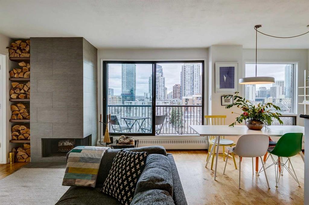 This stylish and modern condo boasts a prime location in the heart of the Beltline, offering Connaught park and the Good Earth Cafe across the street and nearby shops, and restaurants, including a short walk to 17th Ave. Featuring approximately 900 sq ft, this 2-bedroom, 1.5-bathroom unit showcases numerous upgrades, including a stunning updated kitchen with granite counters, stainless steel appliances, and subway-tiled backsplash. The spacious living room features a modernist-inspired wood-burning fireplace with tile cladding, while the balcony offers panoramic views of downtown Calgary and the adjacent tree-filled park. The interior boasts a bright and airy ambiance, thanks to its north and west exposure, offering brilliant afternoon and evening light in the summer months. The open-plan kitchen, equipped with modern Miele appliances, overlooks the living room and dining area, creating an ideal space for entertaining. Cork flooring throughout (excluding the bathrooms) provides excellent insulation for both heat and sound. With a principal bedroom large enough for a king-sized bed, a spacious walk-in closet, and a versatile swing room with French doors that can accommodate a queen-sized bed, den, or office, this condo offers ample living space. Additional features include real stonework in both bathrooms, a deep and spacious tub for relaxation, a friendly quiet building with virtually no neighbor noise, and built-in storage units, armoire, and mid-century style shelving. Enjoy the perks of heated underground parking, along with amenities such as a common space cedar sauna and bike storage with a ski rack. Don't miss out on experiencing this exceptional urban living opportunity!