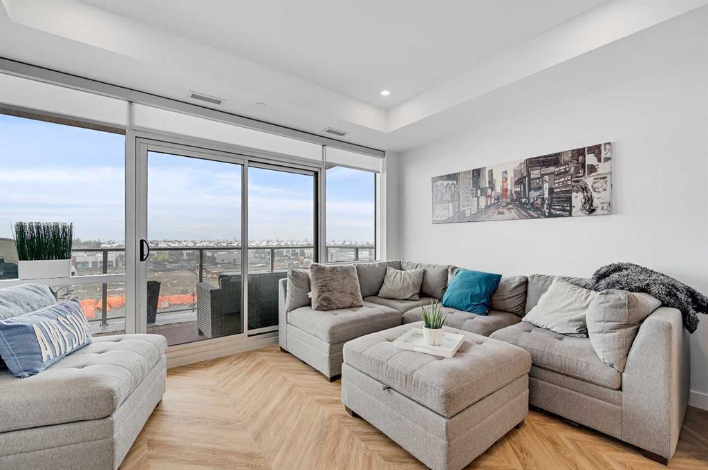 Discover modern condo living in this West Springs gem, with nearly 775 sqft of upscale lving, featuring two large bedrooms and two full bathrooms, tailored for comfort and efficiency.The living and dining areas showcase durable herringbone hardwood floors and natural light. The kitchen features quartz countertops and a custom backsplash, paired with upscale built in appliances for a sleek look. Practical additions like a pull-out pantry maximize space and functionality, making kitchen storage both simple and accessible. Each bedroom offers generous space for relaxation and privacy, with the primary suite including a 3 pc ensuite and generous walk in closet. Step outside to enjoy the large balcony, complete with a natural gas hook-up for a BBQ, perfect for outdoor dining and entertaining while enjoying views of the vibrant neighborhood and COP. Ideally located in the heart of new development, the condo is moments away from restaurants, schools, and public transport, making it ideal for both professionals and families. Its proximity to downtown and quick access to Stoney Trail facilitate easy commutes to the city or leisurely trips to the mountains.Includes a titled parking stall, and assigned storage. Amenities include Lobby Concierge Tues-Sat and a party/event room, as well as secure underground visitor parking. This condo is an excellent choice for those entering the housing market or seeking an upgrade to a lively, amenity-rich area of Calgary.