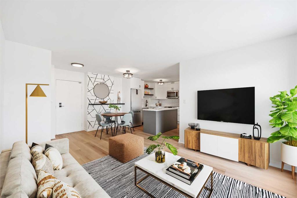 RENOVATIONS JUST COMPLETED! QUALITY FINISHINGS AND DESIGNER STYLE AT AN AFFORDABLE PRICE! Your friends and family will be impressed! This home has Calgary Tower views and underground heated secure parking!! This 2 bedroom/1 bath unit with in suite laundry includes a large balcony for entertaining. Leave your car at home! Walk everywhere! Beautiful open floorplan with space to spread out. This home features a designer kitchen that will thrill the chef in the family. Upgraded new stainless steel appliances and new quartz countertops. Beautiful new luxury vinyl plank waterproof flooring, gorgeous dining room feature wall with built-in shelf and beautiful primary bedroom built-in cabinets and feature wall . Fully upgraded bathroom with designer finishes. Brand new washer and dryer with butcher block countertop in your new storage room. New designer LED lighting throughout. New black out cellular blinds included. PETS WELCOME! Assigned parking stall included. Onsite Fitness Room, Sauna, secure bike storage, party room and additional shared laundry. Very well maintained building! A must see property! Book your appointment today!! No AirBnB