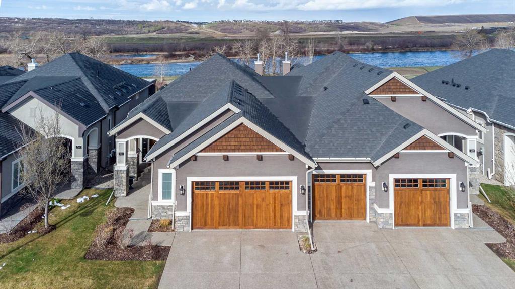 BOW RIVER in YOUR BACKYARD. Welcome Home to the enclave at Cranston of Riverstone Villas. Enter this Home through the 8 foot ornate door into your spacious entry taking you into over 2900 square feet of developed living space. On the right is a private den/office/study, for those who might have to work from home. The main floor is an open concept design that will impress with high ceilings in all rooms. From the chef's kitchen with large granite island, to the high end appliances. Dining area and living room look out over the Bow River through the wall of windows in the living room. The gas fireplace is nice to have on cold winter nights . To the left of the living room is the entrance to the large deck, for entertaining family and friends. I have to mention the views are like, a live painting that changes like the four seasons of Alberta. The main floor also has the master bedroom, with views, and a 5 piece master bathroom with, steam shower, soaker tub, walk in closet and heated floors. Down the crafted staircase, is the massive Recreation room, with built in wet bar, three more bedrooms, and a four piece bath. The utility room has 315 square feet of extra storage and is roughed in for floor in floor heating. Walk out has doors leading to the concrete patio and back yard that back directly on to the Bow River Pathways. All Landscaping and Snow removal is taken care of, allowing for trips away, without the worry. Central air conditioning added last year for comfort. Oversized double attached garage, completes this Home. Cranston has many parks and multiple choices for shopping and is close to all major roadways, making for easy commutes. Come and make this, your New Home.