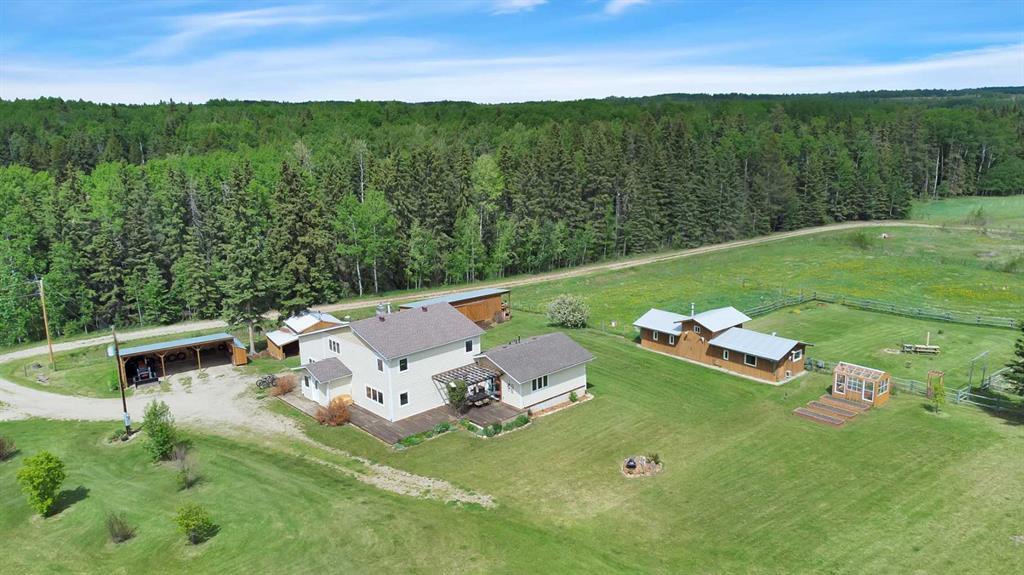 A must see, private 80-acre parcel at the end of a No Exit road, located north of Leslieville and approximately 20 min. NE of Rocky Mountain House. This property is set up for horses and as a hobby farm. Outbuildings include a 3 space carport, chicken coop, large equipment shed for storage of ATV’s etc. with adjoining insulated storage and dog kennel, barn with tack room and workshop, greenhouse, small animal shelter, treehouse, and small toy shed. The barn is currently set up as a Blacksmith’s forge with metalworking area but can easily be turned back into stables for horses or other livestock. All outbuildings have power, and the barn has 220V as well. The parcel is perimeter fenced on 3 sides, cross-fenced to provide 8 separate pastures and more can easily be added. There are 2 stock waterers on the property (one used year around, one seasonal). Water and power hook ups for RVs, and an additional natural gas line for a future shop or garage. This property has 2 oil leases, nicely situated away from the house and generating $8,610 per year in revenue. This ideal set up is complimented by a spacious and move-in ready home. The main house is approximately 2524 sq.ft. The house was started in 1972 and expanded on in 1986. In 2014, the owner added on to the home to provide a large kitchen/dining area, a mud room, a bonus room above the dining room, a walk-in closet in the master bedroom, and a 3rd bedroom. The siding, windows, doors, shingles and approx. 50% of the original electrical (incl. electrical panel) and plumbing were also upgraded in 2014. The home offers a bright and open floor plan and a modern farm décor. The main floor foyer leads you to the large kitchen and dining room on one side. On the other side, you will find a spacious living room with a lava rock wood burning fireplace with a high efficiency insert just installed. (Part of the living room could be converted back to a 4th bedroom with direct access to the main level bathroom). The attached 528 sq.ft. guest quarter was added on in 2017. This fully self-contained space with in-floor heat, is perfectly set up for generational living, an ideal retreat for guests, or has the potential to generate revenue. The wrap around deck accommodates access for the main house and guest quarters. Other upgrades include new hot water heater, high efficiency furnace and top-of-the-line boiler system, all installed in 2021. Pressure tank and well pump was replaced in 2019/2020. The property is beautifully landscaped with various ornamental trees and flowering bushes providing vibrant autumn colors. There are various fruit trees / bushes and Hops in the Orchard / Beer Garden behind the barn. Numerous low-maintenance flower beds with perennials / flowering bushes and a rock garden with fountain completes the yard. Around half the property is treed with nice trails throughout for walking and riding horses or ATV’s. This property shows pride of ownership and must be seen to be truly appreciated
