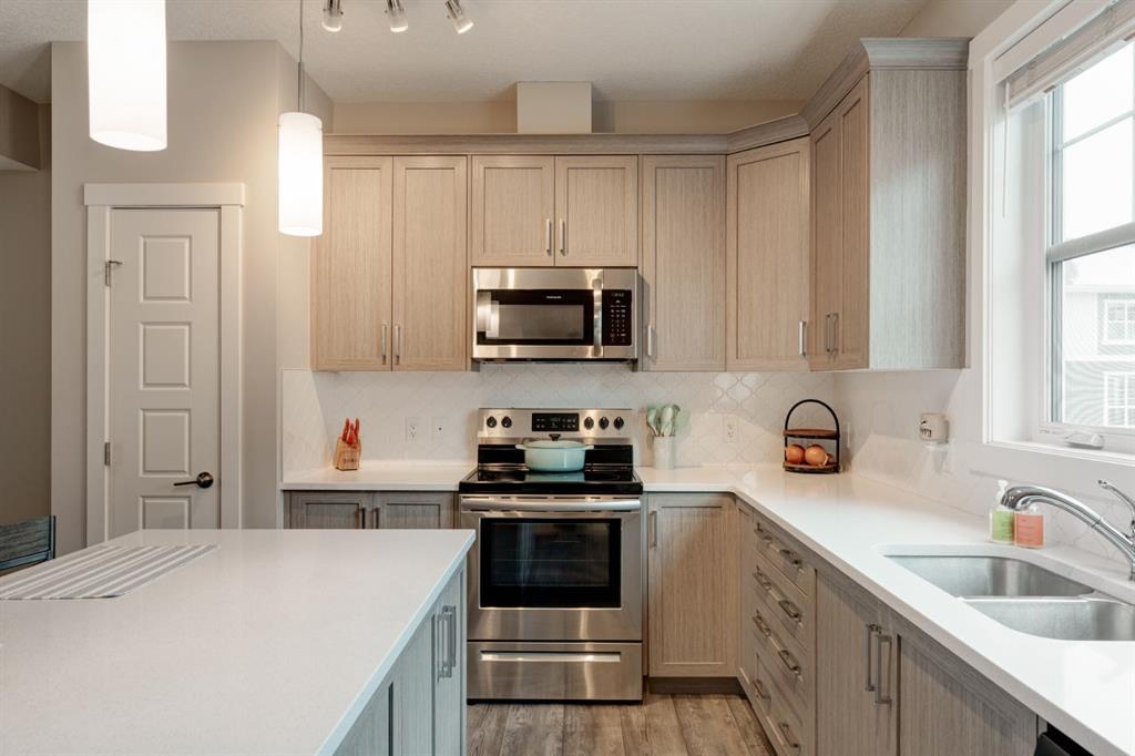 This well-cared for and like-new townhomes features 2 bedrooms, 2.5 bathrooms and a private double attached (tandem) garage located in the heart of Riverstone overlooking green space. The bright and spacious main level has an open concept layout with a large kitchen that overlooks both the living and dining spaces. The kitchen is complete with warm mid-tone cabinetry, quartz countertops, a full pantry, a suite of stainless steel appliances and an island with additional seating. A large window over the kitchen sinks allows natural light to pour through the space all day long. Resilient vinyl flooring flows throughout the main level and the open layout makes the perfect space for entertaining. The main level is complete with a 2 pc powder room. On the upper level there are two primary bedrooms, each with their own private ensuites. Vinyl flooring flows throughout the upper level as well - perfect for those with pets, children or allergies to carpet. The largest primary bedroom overlooks the park / green space on the development and captures natural light all evening long. The room is complete with double closets and a 3 pc ensuite with walk-in shower. The second primary bedroom includes double closets and a 4 pc ensuite with tub and shower. The central hallway between the bedrooms includes a linen closet, conveniently located upper-floor laundry and a flex space with ample room for a desk if desired. The private double tandem garage has space for two vehicles or could be a great spot for a home gym + additional storage for those with one vehicle. This home is equipped with central A/C to keep you cool all summer long and the attached garage will keep your vehicle and valuables safe as well. Located in one of the best spots - this townhouse overlooks the development's green space and is within walking distance to the countless pathways and Bow River - all within Riverstone! With easy access to Seton's amenities and major roads, this property is perfectly located and ideal for first time buyers, downsizers or investors! **Virtual tour available upon request.