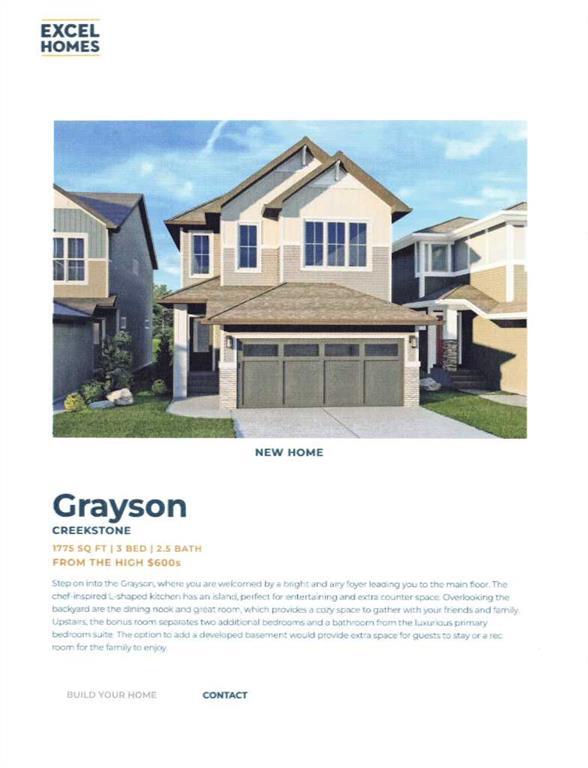 Welcome to The GRAYSON. A beautiful new home TO BE BUILT by EXCEL HOMES! Anticipated possession is approx. 9 months from firm offer. Lots of time to personalize your new home & choose your options! Located in the up and coming community of Creekstone / Pine Creek - West of Macleod Trail in South Calgary, offering a dynamic family lifestyle, with access to nature and amenities. Parks & pathways weave into surrounding communities & ponds. This home is close to a park & offers a sunny SOUTH backyard with 1775 sf of well-designed living space. SEPERATE SIDE ENTRANCE to basement landing - and this home has been roughed in for a LEGAL SUITE. Basement has 9' ceilings! A bright and airy foyer leads you into the open main floor plan that boasts a large kitchen, dining nook & family room that overlooks your sunny south facing backyard! You’ll have 9-foot knockdown ceilings on the main floor – luxury vinyl plank flooring – stone countertops – beautiful thermally fused laminate cabinets & lots of windows for optimal capture of natural daylight. The chef inspired kitchen features a great prep island for extra space & entertaining. Moving upstairs you’ll find 3 generous bedrooms – bedrooms 2 & 3 are separated from the primary suite by a family sized bonus room. The primary suite offers a walk-in closet & spa like ensuite. Your laundry room & an additional family bathroom are located on this level. The option to add a developed basement for extra space is available. This home will be a “Built Green” home with solar conduit – Low E windows – Hi eff furnace – Heat recovery ventilator – EnerStar rated appliances – Smart Home Essentials and so much more.