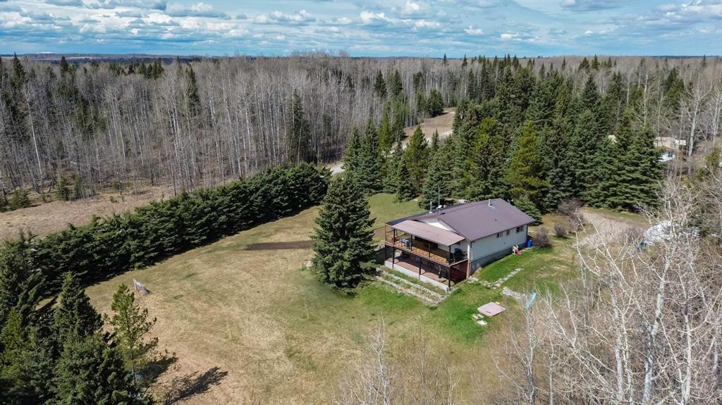 This hillside bungalow with a walk-out basement.... on 4 acres offers 1050 sq.ft. of comfortable living. Upper deck is a wrap around with access to the home with 2 patio doors. Lower level offers a covered patio. Main floor laundry with 2 bedrooms up/2 down. Beautiful maple kitchen cabinets in the galley kitchen. All new vinyl plank flooring throughout. Double detached garage and storage sheds are included. The acreage parcel is well treed with trails through the trees...very undulating property with lots to offer