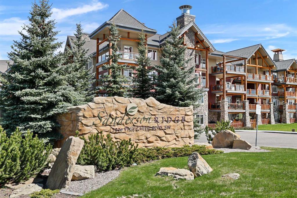 BACK ON THE MARKET due to pet policy not allowing 2 cats. This stunning third floor condo exudes modern elegance. The minute you step inside, you’ll notice the beautiful plank hardwood floors, the 9-foot ceilings, spacious foyer, porcelain tiles in bathrooms and laundry room, high-end light fixtures including recessed lighting and pendant light fixtures above peninsula island, a bright open floor plan drenched in sunlight. You will be amazed by the gourmet kitchen, featuring “Superior Cabinets” full height with soft close drawers and cupboards, gorgeous quartz countertops, trendy backsplash, under-mount porcelain double sink, high-end S/S appliances including a high quality gas range, stylish hood-fan, French door refrigerator with water and ice maker, built in dishwasher and microwave drawer. Abundant natural light floods the dining and living room areas creating a warm and inviting atmosphere. Off the main living area is a French door opening onto a massive SW facing balcony (approx. 29’ X 12’) with gas BBQ hook-up. Perfect for entertaining. The primary suite has a walk-in closet with custom closet organizers. Relax in the spa-like ensuite after partaking in the many activities that Sanderson Ridge has to offer. You’ll love the guest bedroom/den which has a large walk-in closet. In-suite laundry with a washer & dryer plus great storage space and a 4-piece bath with a deep soaker tub completes the suite. In addition, this unit comes with 1 heated underground parking stall and storage area. You’ll be delighted with Sanderson Ridge, an adult community that cradles beautiful Fish Creek Park. No detail is overlooked, from the stunning craftsmanship of the exterior timber, the unsurpassed quality in the finishes of your suite to the dazzling array of amenities. Sanderson Ridge is well equipped for any hobby. Pool tables, games & poker rooms, fitness centre, bowling alleys, craft room, wine cellar & woodworking shop-complete with power tools-are waiting for you. There's a movie theatre, swimming pool, hot tub, steam room, coffee bar, fully equipped kitchen & "The Sanderson Room" available for events, 8 guest suites & 2 car-wash bays.