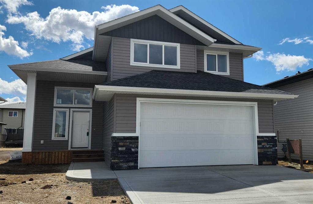 WELCOME TO THIS BEAUTIFUL NEW BUILD SAN MARIA HOMES MODIFIED BILEVEL WITH A REAR SOUTH FACING DECK AND YARD IN THE ASPEN LAKES SUBDIVISION OF BLACKFALDS! Tiled Front Entry, OPEN CONCEPT DESIGN LIVING/DINING/KITCHEN at the rear/south of the home with vinyl plank flooring, vaulted ceilings and a stunning central electric fireplace with a floor-to-ceiling stone surround... Crisp white linen paint throughout. Impressive and functional dream kitchen with dark maple cabinetry, full tile backsplash, quartz countertops, center island/breakfast bar, pantry and all stainless steel appliances included. Adjacent to the kitchen is the good sized dining area with a garden door out to the sunny south facing deck. Two bedrooms on the main level and a 4 pce bath with quartz countertop and tile floor... Primary Bedroom on the upper level with a magnificent walk in closet and 4 pce ensuite with quartz countertop and tile floor. High efficiency furnace, roughed in vac, roughed in basement infloor heat. TAXES ARE NOT YET ASSESSED....Note: This home is in the final stages of refinishing and so there are no exact interior photos yet. This listing's photos are the same floor plan of a previously sold house. Changes to this home are in backsplash kitchen tile, fireplace stone colour, dark grey entry tile and alternate light fixtures...