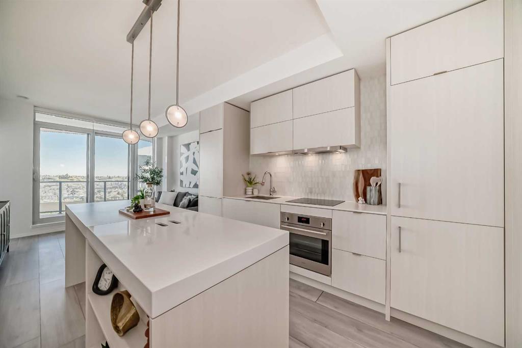 Welcome to Verve in East Village, this contemporary and sleek 1 bedroom & 1 bathroom unit features an abundance of natural light with an open floor plan. The entrance offers a coat closet and nook space for additional storage or office desk. The kitchen features integrated appliances, ample cabinet space, quartz counters, built-in shelving & a breakfast bar. The living room and master bedroom feature floor to ceiling windows that have amazing views of the Bow River. The 4pc bathroom has quartz counters, ample storage space & a rain fall shower head. Enjoy the convenience of in suite laundry! The spacious balcony offers a gas line for an optional BBQ. The Verve building features many amenities including party room, fitness centre, concierge, guest suite, 24 hour security, visitor parking, bike storage and roof top terrace. Convenient location only steps away from the Bow River pathway, Central Library, Bell Studio, Stampede Park, shopping, restaurants, LRT. Don't miss the opportunity to make this your new home!