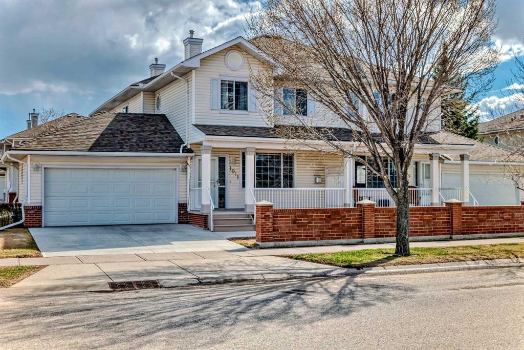 A RARE FIND - The units in this complex very rarely come up for sale - it is a quiet, beautifully maintained bare land condo. This one has all the attributes of a single family home with all the benefits of condominium living - no more landscaping and snow removal (vinyl fencing and reshingling the roof has been done recently). It is a 2 story townhome, with its own double garage directly off the city street and a wide open park across the street for pleasant viewing while you sit on your porch sipping on your morning coffee. You feel the warmth as soon as you enter through the foyer into your large living room with a corner gas fireplace and open to the dining area. The big kitchen with a walk in pantry allows you options of a kitchen nook or extra cabinets (or both). Upstairs you'll find a big master bedroom with a 4-pce ensuite (with soaker tub) and a walk in closet, 2 other good sized bedrooms, a 4-pce main bathroom and laundry facilities - perfect for ease of laundry handling. Don't forget the central vacuum system. Your basement is wide open for however you want to develop it, roughed in plumbing for another bathroom, mid efficiency furnace complete with humidifier and a large hot water tank. Check out the patio off the kitchen - perfect for your morning coffee , evening cocktail or friends and family dinner get togethers. This is a very quiet +45 complex - perfect for your carefree living pleasure. It's also very close to all kinds of shopping, walking trails, schools and Stoney Trail without the traffic noise. You need to see this one before it goes. Please note this is a + 45 complex, however the Board will allow returning 18+ university students to stay with their parent(s)