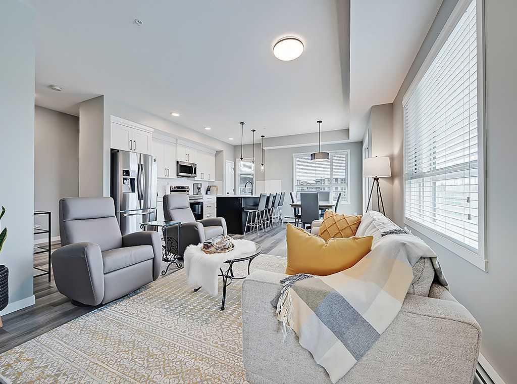 Welcome to The Rise at the Parks of Harvest Hills! Truly a rare opportunity, this spacious TOP FLOOR, CORNER UNIT, with 2 bedrooms and 2 bathrooms is being offered for the FIRST TIME on the market. Not only does this gorgeous condo built by well-known and respected Cedarglen Homes look brand new (it’s barely been lived in), it’s located in a newer complex inside the well established 90’s community of Harvest Hills. No need to drive way out to the edge of the City to suit your needs, you’ll already be home from work (or the Airport - 8 min away) while everyone else is still cursing the rush hour traffic! The thoughtful layout begins with an entry hallway/foyer that first gives access to a huge dedicated laundry and storage room. Featuring a modern, contemporary design that’s sure stand the test of time, with premium vinyl plank flooring, crisp white shaker-style cabinets, and sleek white quartz countertops, the kitchen also features a peninsula island that comfortably seats 3 people, and suite of stainless appliances. Not only will you fall in love the amount of natural light flooding into this CORNER UNIT with all those extra windows, you’re sure to appreciate having a dedicated dining room space, which is lacking in far too many condos these days. Both spacious bedrooms benefit by the privacy of being located on opposite sides of the unit, and the luxurious 4-pc ensuite off the master gives way to walk-in closet. Step outside and you’ll be amazed the WRAP-AROUND balcony giving panoramic views from the SE to the North, and a natural gas hookup means you’ll be enjoying those legendary summer Calgary sunsets with limitless BBQ time. When you leave the unit, take the elevator that’s only a few short steps away (unnoticeable from inside the unit) to the underground and you’ll also find your TITLED parking stall (520) only steps away from the elevator entrance. This wonderful complex is ideally located close to Deerfoot Trail and within walking distance to every store and restaurant you could ever need, including movie theatres. It MUST be seen to be appreciated so we look forward to your visit!