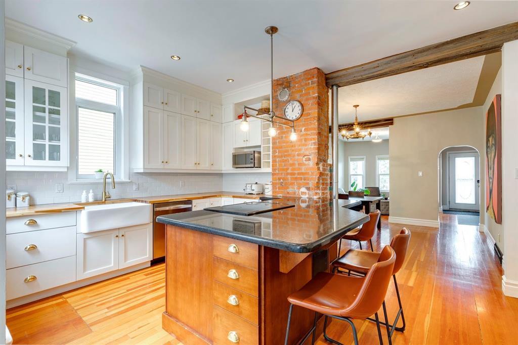 Prepare to fall in love! Own a piece of Calgary's history with this century-old charmer. The walk-up basement suite is perfect for in-laws, outlaws, or anyone else who enjoys their own private entrance. (*Please note that legalization of suite is in final phases, inquire for more details) Nestled on a quiet one-way street, this 1912 vintage home will greet you with a tiered front yard, soaring evergreens & cedar garden boxes. The west facing, expansive front porch is ideal for your morning coffees or evening night caps. Once inside, charm is exuded in the high ceilings, exposed brick, original light features, doors with actual character, vintage touches, & vent covers that are not from your average home improvement store. The open-concept living, dining, & kitchen area offer many sightlines & easy flow. You get granite & butcher block countertops, a farmhouse-style sink, and enough floor-to-ceiling built-in cabinetry to make even a minimalist reconsider their life choices. There’s a recycling lazy Susan in the corner cabinet, because why not add a little spin to your environmental commitment? The rear mud/laundry room has a built-in ironing board for when you need to pretend you're domestic, and a storage bench that’s perfect for hiding shoes or storing all the umbrellas you’ve never used. Step out into the backyard, where you can practice your BBQ skills or relax under the climbing ivy-laced pergola covered deck. Upstairs, the primary suite comes with a walk-in closet—a rare find in a house of this vintage—and its own west-facing balcony. Two additional bedrooms await, one with yet another balcony, why not? The full bathroom has art-deco vibes and a clawfoot tub. The lower level is its own self-contained living space, with Euro-style laundry, a full bathroom, a kitchen with soft-closing cupboards, a bedroom, and an open living area. The walk-up layout, complete with seven large windows, allows for higher rental income potential, not your typical "dungeon" basement suite. There's even a hidden storage room under the front porch for all your secret stash of tools & outdoor gear. The house has had many capital upgrades, including most windows (2010), roof (2014), high-efficiency furnace (2018), interior & exterior paint (2022), hot water tank, integrated smoke/CO2 detectors, electrical breakers (2024). The house is wired for sound throughout & includes built-in speakers/amp. Bankview is a lively community with parks, tennis courts, community gardens, & shops so close you might actually walk places. Schools are within walking distance - Richmond K-6 and Mount Royal 7-9. At the end of the street there's a brand-new playground w/ a climbing wall at Buckmaster Park. Nearby Marda Loop community centre has beach volleyball, pump track, outdoor pool & pickleball. You can even explore adding a heritage designation to this home to access municipal grants for upgrades.