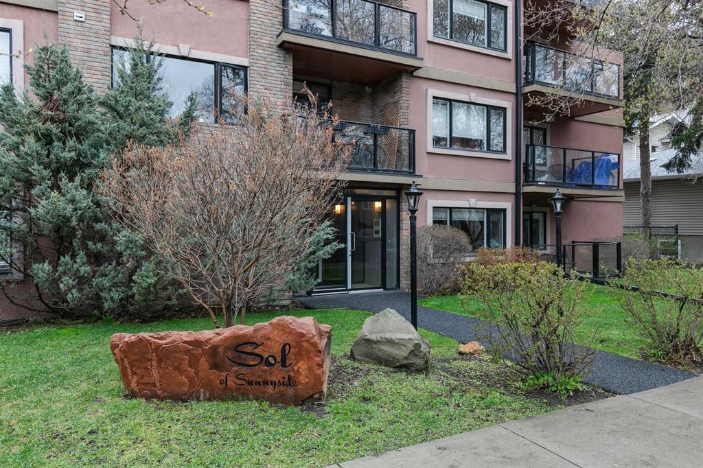 Inner city living at its finest here at the Sol of Sunnyside. Enjoy this beautiful 1 bedroom/1 bathroom condo nestled in the heart of Sunnyside with views of McHugh Bluff and located with steps to charming coffee shops and restaurants. A modern and functional kitchen is equipped with gleaming appliances, granite counters, pantry and a centre island with raised breakfast bar. The living room boasts a great built-in media cabinet with an abundance of shelving, pot lights, and an electric fireplace. Step out onto your private balcony that faces the lush treed bluff for zen-like tranquility. A generous bedroom offers mirrored sliding closet doors and a 4pc bath comes with storage. The convenience of having your own in-suite laundry with extra storage adds to the appeal of this fabulous unit. Sol of Sunnnyside is a quiet concrete building with low condo fees that include heat and water/sewer. Flooring has been recently upgraded in the main living space. The unit is currently tenant occupied and the tenant would like to stay for any investors looking for a near turn-key unit. This property is also ideal for first time home buyers looking to get into the market. If you're looking for an idyllic lifestyle with considerable amenities, walking/bike paths nearby, and quick easy access to the DT Core, then this is the condo for you!