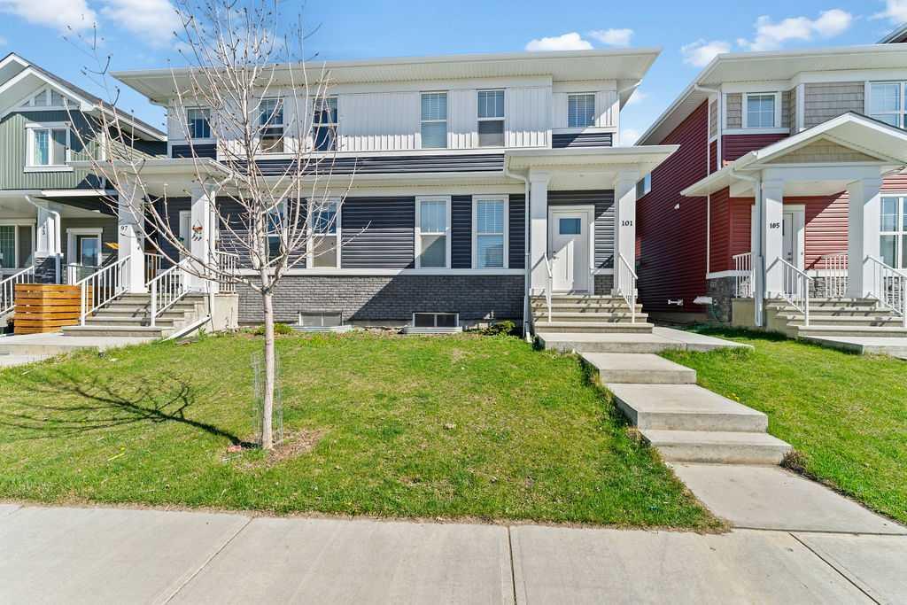 Stunning half duplex featuring legal revenue suite! This previous showhome is an exceptional turnkey opportunity for an investor, or someone looking for a mortgage helper. The upper unit comes fully self contained with 3 bedrooms, 2.5 bathrooms, full laundry, built in desk and much more. Gourmet chefs kitchen offers ceiling height soft close cabinetry, stone countertops and gas range. Off the kitchen you will find a large dining room and mudroom leading to a deck and double detached garage. Full sized laundry located on the top floor along with large primary bedroom with coffer ceiling, large walk-in closet and the ensuite with dual vanity and deep soaker tub. 2 Additional cozy bedrooms featuring walk-in closets round out the functional upper level. Downstairs you will find the 1-bedroom basement suite with 9 foot ceilings, large windows and the same upgraded finishes throughout including designer tiles, wide plank flooring and LED pots lights. Located in the new community of Redstone this property is steps from greenspace, a school and the soon to be extended train line, amenities and lots of new development.