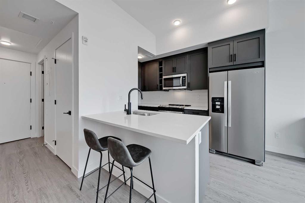 *VISIT MULTIMEDIA LINK FOR FULL DETAILS & FLOORPLANS!* Experience modern living in this PET-FRIENDLY TOP-FLOOR STUDIO APARTMENT with SOARING CEILINGS, and CLEAR VIEWS OF THE AVENUE & MOUNTAINS. Located on University Avenue in the heart of the University District, you'll enjoy seamless access to essential amenities, restaurants, shops, entertainment, dog parks, and walking trails. Plus, ENJOY THE FIRST YEAR WITHOUT CONDO FEES! This brand-new unit built by Homes by Avi offers sleek laminate flooring, high ceilings, a kitchen with quartz countertops, stainless steel appliances, and a central island with breakfast bar seating. The living, sleeping, and kitchen areas are integrated into a single space creating an open and flexible environment. The living room is open and bright, and the sleeping nook has a dedicated closet. The 3-piece bathroom has a stand-up shower and a quartz vanity, while the South-facing balcony provides stunning views, a rough-in and electrical outlet for future A/C and a gas line for a BBQ. Additional conveniences include in-suite laundry and an assigned storage locker. An upgraded furniture package is available at an additional cost. The Argyle building, designed for a 5-star experience, includes a top-floor fitness room, an outdoor patio, a community garden area, an owner's lounge with a kitchen, secure bike storage, a meeting room, and a parcel storage room. The University District offers prime shopping and dining options, parks, ponds, and easy commuting via Crowchild Trail and other major routes. Whether you're a student, a professional, or just seeking a vibrant urban lifestyle, this studio unit has it all. Contact us today to schedule your private viewing!