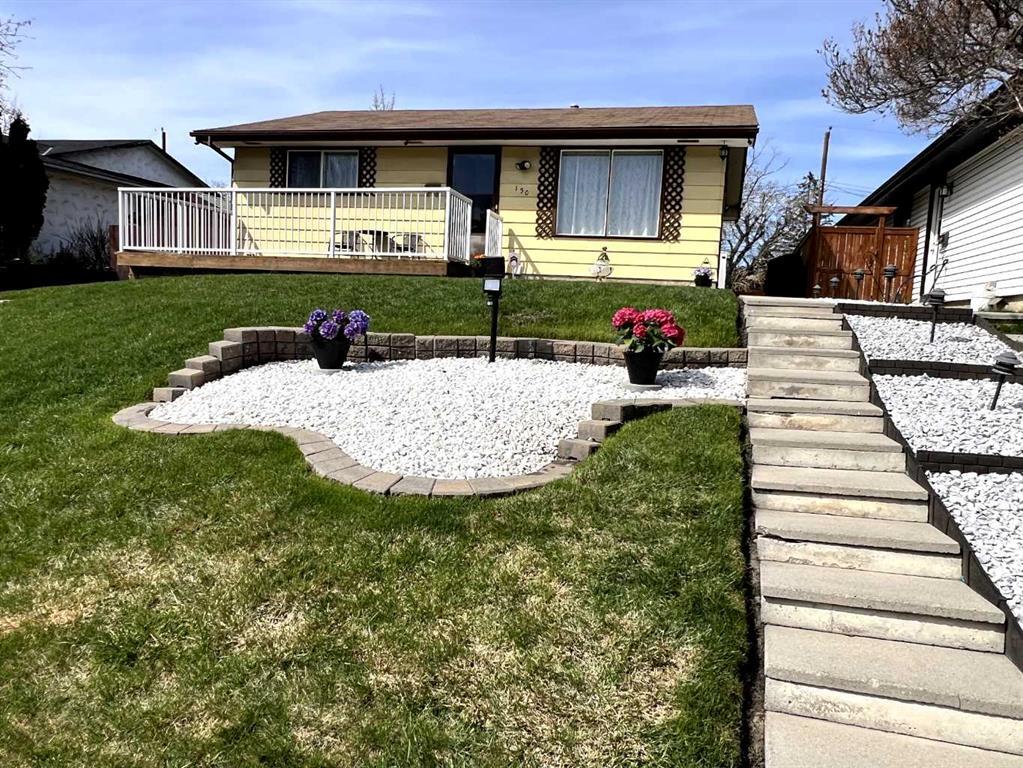 Welcome to this wonderful home, with a nicely landscaped front yard with lighting in the evening to brighten the steps up the walkway. Huge front deck that is framed with white railing is excellent to enjoy the sunny days ahead. Enter this cozy home & notice the modern grey carpet only a couple years old. A large south living room window lets in the sun while a gorgeous ceiling fan hangs from above for those summer days. A good sized room with a feature wall as a pop of color in contrast to the neutral paint throughout the remainder of the house. Step into the kitchen which offers space for your table set. A dual sink with pull out spray tap are a must! Solid wood cupboards span across two walls for lots of space. The modernized countertop + backsplash are nice updates along with the stylish lino flooring. Fabulous Stainless Steel fridge with bottom freezer included. A kitchen window offers a view of the backyard. Centrally located is the full bathroom with a fantastic bathfitter remodeled bathtub with tub surround offering a tub or shower selection. Additional updates include the taps, mirror, lighting & backsplash behind the long vanity counter. The master bedroom is next with dual mirrored closet doors & a ceiling fan too. The middle bedroom is a decent size & currently is used to host the 5 camera video security system + there are 4 storage cabinets in here that can stay. Directly across the hall is a surprisingly large storage closet. The bedroom at the front of the home is a wonderful size with another nice sized window. Down in the basement is a generous sized rec room which would be great for so many uses! The laundry room includes a washer plus a dryer that was replaced not too long ago. There are cabinets & a hanging bar for clothes + the deepfreeze is in here too for easy access. Tucked away is another flex room that perhaps could become a bedroom as it includes a window for natural light or a home office or a kids playroom/music room. A storage room is to the left of the laundry & has an attached shelf plus moveable shelves that can also stay. This large basement additionally offers another lengthy storage room off the rec room, great for all your suitcases & seasonal items. In here there are also tons of additional matching floor tiles + extra laminate that will be left with the home. Check out the backyard which is fully fenced great for kids or pets. A total of 4 sheds are included. Patio is perfect for sitting out back while lots of grassy area for running around. There's also a firepit which completes this lovely yard. Also option for RV or off street parking out back too. Perhaps a future garage could be made on this flat backyard. This home is sure to impress as it is sparkling clean & includes a High Efficiency Furnace, NEST Thermostat & Shingles redone in 2012. Property sides onto a community path which offers space from neighbors & offers easy access to the schools a few block away. Or walk around the Close to the SE corner to the playground.