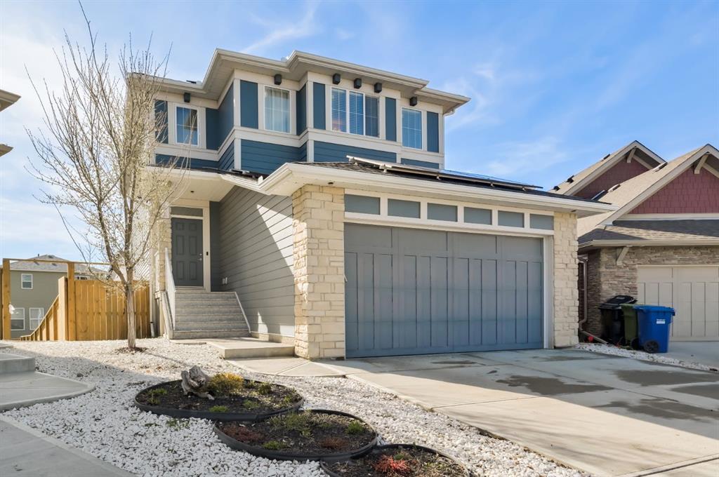 Welcome to your dream home in the heart of Legacy, a family-friendly neighbourhood. This remarkable home has 3,000+ sqft of usable space. It features 4 bedrooms, 3.5 bathrooms, and a WALKOUT basement. Nestled on a spacious pie lot with a serene west-facing backyard, it's perfect for relaxation. Step inside to an open foyer that leads to a beautifully designed living area with elegant LVP flooring and 9-foot ceilings. The well-appointed kitchen boasts sleek cabinetry, granite countertops, a large breakfast bar, and high-end stainless steel appliances. The cozy living room, highlighted by a ceiling-high stone fireplace, adjoins a bright dining area with direct access to a sunny balcony and BBQ hookup. On the main floor, you'll find a versatile den/office, practical mud/laundry room off the garage, and a convenient 2-piece powder room. The UPGRADED garage features Polyurea GranitShield flooring for a showroom style finish. Upstairs, there are 3 bedrooms, 2 full bathrooms, and a spacious west-facing bonus room. The primary suite offers a luxurious 5-piece ensuite with double vanities, heated flooring, and a soaker tub, plus a spacious walk-in closet. A 4-piece bathroom serves the second and third bedrooms. The finished walkout basement includes a vast recreational space, a 4th bedroom, a 3-piece bathroom, and ample storage plus enjoy the luxury of high ceilings and access to sunny patio. ADDITIONAL FEATURES include; 10W DC solar panels, in ground irrigation, 220V plug-in in garage, permanently installed WIFI trim lighting, and central A/C. This home is close to Legacy's new K-9 school, walking paths and top amenities like restaurants and shopping. With a vibrant community spirit, it's one of Calgary's prime trick-or-treat streets. Don't miss the chance to make this stunning property your own—book your showing today before it's too late!