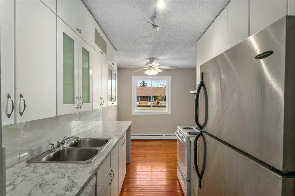 Welcome home to this recently updated TOP FLOOR CORNER unit in the well established community of Canyon Meadows! This well located building is named Anderson Place which is well managed building in the heart of the action of this desirable southwest Calgary corridor. The unit features brand new paint on the walls to in a neutral inviting color with contrast to the fully refinished and repainted white trim/baseboard heater covers, durable hardwood floors, new backslplash in the kitchen to complement the brand new counter-tops! The bedrooms are roomy enough for most configurations leading you through the unit to the bathroom with new counter-top to match the kitchen as well as a freshly re-finished tub for soaking after the long days at work. Facing onto the beautiful court-yard with massive mature trees makes this unit very quiet and you can enjoy your morning cup of coffee overlooking this green oasis in the summer time + host BBQ days with your friends and family. Storage is no issue in this unit with a massive storage area with new shelves added, could also be used an an office/den area if your inner-minmalist does not need as much storage space! INVESTORS take note that the rents for these units has increased significantly this year and being so close to shopping, restaurants, transit, and all the amenities people need with a short drive or walk away this makes for a great stable rental property. Anderson place is located close to these incredible amenities; biking trails, fish creek park, south glenmore park, movie theatres, so come experience all the south Calgary lifestyle has to offer. Book with your favourite agent today!
