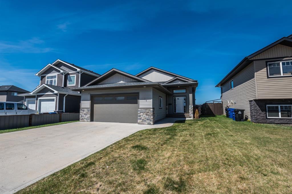 Looking for a quiet area to raise your kids or to enjoy retire? THIS BEAUTIFUL 2016 BI-LEVEL in lovely area of Blackfalds is the perfect place! Plenty of curb appeal with the sweet south facing front porch to drink your morning coffee or watch your kids play road hockey on this quiet moving street . Welcoming large front entry (with huge closet ) that also leads to finished double garage. Exceptional main floor with soaring vaulted ceilings and open floor plan dining, kitchen and living room. Kitchen offers large island for extra seating, lots of cabinets and plenty of space in corner pantry. Gas fireplace in living room with doors to huge deck! Main floor also offers nice sized family bathroom, 3 bedrooms including large primary with his and her's closets plus 4 pce ensuite. The basement is ready for development and with lots of big bright windows there is so much potential. The back yard already landscaped has massive deck with storage area underneath, also lots of room for R.V. parking with R.V. gate! Perfect place for the kids to play or to enjoy your summer days. The large finished double garage also has a great built in work bench for the handy home owner! A great home, and a pleasure to view!
