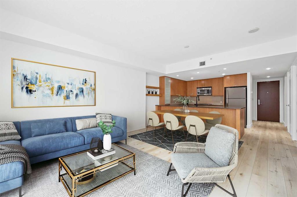 Fully renovated executive condo with spacious open floor plan in Calgary's desirable Beltline community. This luxurious 1 bed/1 bath unit is located on the 18th floor of the popular Nova Building. Upgrades include: new Luxury Vinyl Plank flooring throughout, all walls and ceilings have been re-painted, new bathroom vanity and light, decorative ship-lap wood wall treatments plus wallpaper in the bedroom. The gourmet kitchen features quartz counters, breakfast bar, soft-close cabinetry, high-end stainless steel appliances with gas stove. Nine foot ceilings with floor to ceiling windows make for a bright, open space. Extras include a built-in desk/workstation, Air Conditioning, large in-suite storage room and a balcony with fantastic downtown views plus titled underground parking. The bedroom has walkthrough closet to the 4-piece ensuite, with in-suite laundry, separate shower and soaker tub. Within walking distance to the best of what Calgary has to offer: bike to work, minutes from trendy shops and restaurants on 17th Ave. The Nova building features full-time concierge service and security, party room, owner's lounge, guest suite, gym and steam rooms. Call your favourite Realtor today for a private showing.