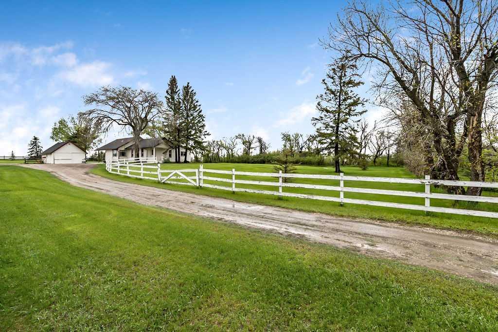 Nestled in between farmland and surrounded by trees, you will find the most peaceful space you could imagine...a place where you can breathe and just enjoy life. Quaint country home of which the original homestead boasts gleaming wood beams and baseboards. Additions throughout the years (1960's) to the original home make it a great space for family. Exterior is maintenance free with vinyl siding and this house was built solid (they don't make them like they used to!). Original dirt basement has been replaced with concrete. Main floor is bright and warm with large "mud room", country kitchen with flour and sugar bins plus plate rails in the cupboards, large eating area, huge corner pantry, stacked laundry in closet, cozy nook to relax and read, huge living room, two full baths, primary and second bedroom, both with large closets containing built-ins, and an office/den which could be used for a third bedroom. Basement has 376 sq ft developed space with another laundry area & huge family room. There is also 452 sq ft of undeveloped space which includes the mechanical room and tons of storage. Incredible amount of storage throughout upstairs and down. Wander outside to the guest cabin which has a bedroom and living room (the bedroom was originally the grounds keeper's!), and outhouse! Next to this you will find a beautiful garden & rock waterfall. A little further along you will come to the huge heated shop (220v/100 amp) which has a storage shed attached at the back, and an incredible outdoor kitchen which includes custom made bar, gas bbq, bar fridge, outdoor lights and pressure treated decking. This is an amazing gathering place! There is 2.5 acres of pasture and a large fire pit area. The barn has 3 paddocks & tack room (220v/30 amp). Shelter on each side of the barn offers space for farm equipment and/or could be used as a carport. Upstairs is an amazing area with unlimited uses. 6 skylights bring in natural light. Detached garage offers more storage space (220v/100amp). There are two wells on the property and equipment has been relocated to the main home basement. Two huge garden areas have been freshly plowed and are waiting to be planted. There is also a tomato shed at the side of the barn. Beautiful area at the front of the property which has been used for a "friend & family" campground. This is total nature and a true sense of turning back time from picking up your mail at the end of your driveway at your red mailbox (mailing there too!), the resident owls, moose wandering through, an occasional eagle, the goose that just had her goslings to the opportunity to "live off the land". Rain barrels throughout, water access in several locations, compost piles to get started and lots of wood for the firepit. Trees throughout this property are amazing. All located within 30 minutes or so to Okotoks, Calgary & High River. Aspen Crossing, Mossleigh and Carseland are about 15 minutes away. This is a "must see" to appreciate the property. Come visit and decompress today!