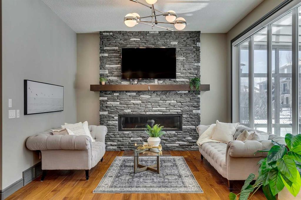 Welcome to this luxurious 5 bedroom, 3.5 bathroom home, spanning over 4000 square feet and a true masterpiece. Located in the highly sought-after, family-oriented community of Auburn Bay, this home offers access to a private shared dock on the lake, enhancing its prime location! The split triple garage features IN-SLAB heating and a private dog wash, ideal for pet lovers. Gemstone exterior lighting and MOTORIZED Hunter Douglas blinds ALL throughout the home adds a touch of elegance to the entire house. With two furnaces and air conditioning, comfort is assured year-round. The Kinetico water softener with a reverse osmosis water filter system ensures pristine water quality. The backyard has an irrigation system and gorgeous patio with pergola backing onto a walking path directly to Auburn Bay Lake, creating an outdoor oasis. This exquisite home is situated in a prime location, within walking distance to a private dock on the lake AND a secluded green space for summer relaxation. The main floor features 10-foot ceilings, an office, THREE mudrooms, and engineered hardwood flooring. The chef’s dream kitchen boasts QUARTZITE countertops, soft-close cabinets, Bosch appliances including a convection oven, separate steam oven, a walk-in pantry, and a featured pot filler. A PROFESSIONALLY designed sunroom off the dining room provides a perfect year-round retreat. The elegant open riser staircase leads to a bright and airy bonus room with a high vaulted ceiling. Upstairs, you'll find two additional bedrooms and a magnificent primary bedroom with 9-foot ceilings as well. The primary bedroom includes a den full of opportunity, double-sided fireplace, and a HUGE walk-in closet with a custom California Closet organizer. The luxurious ensuite is a sanctuary, featuring a double vanity, jetted tub, STEAM SHOWER, and ceiling-high tiles. The basement is equipped with a professional gym, spare bedroom, large rec room, wet bar, and in-slab heating throughout. This exceptional property offers everything you could desire, with its location being a standout feature. A short walk to the lake with private green space and dock access makes this home a must-see! *Check out the virtual tour*