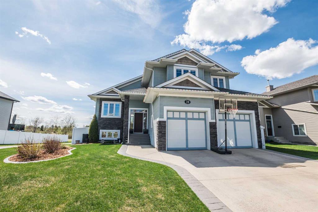 A fully developed modified bilevel with a walk out basement backing on a pond! The curb appeal is accented by the stamped concrete bordered driveway, stone accents & separate double garage doors. The front entryway greets you with tile flooring and a decorative wood feature wall. Relax in the living room next to the gas fireplace with stone surround and a wood mantle, towering 30' vaulted ceilings, a wallpaper feature wall, newer wall sconces & hardwood floors. Follow the fanned hardwood stairs with aluminum railings to the open style floor plan. Staggered alder kitchen cabinets are complemented by newer quartz countertops, full subway tile backsplash, a sil granite sink, trendy gold hardware, a garburator, stainless steel appliances, some glass fronts, pantry style cabinets with pullouts & undercabinet lighting (remote controlled with colour options). The dining area has a builtin coffee bar/ desk & a patio door to the west facing upper duradeck with aluminum railings & a professionally installed electric awning (remote controlled & a wind sensor) that overlooks the pond. There are two nice sized bedrooms both with fans & custom wire closet organizers (one with a walk in closet with laundry hookups) & a 4 piece bathroom with a deep tiled tub/shower. Upstairs is your primary bedroom retreat, king sized with vaulted ceiling, a fan, a walk in closet with custom wire shelving (with drawers) & a 2 sided gas fireplace that sides onto the 5 piece ensuite that features double sinks, a soaker tub, a custom glass/tile shower, a water closet and underfloor heat. The basement has 2 additional bedrooms, a family room with a wet bar & a 4 piece bathroom with a deep tiled tub/shower. You will love the brightness from the walk out basement that leads to the lower level covered unistone patio with professionally installed "dropees" outdoor blinds that provide shade and privacy. There is a large storage/ laundry room on the lower level. The yard is fully landscaped and vinyl fenced with a beautiful view of the pond and walking path. There are rain barrels & astro turf on the side of the house. The home has A/C, Rinnai hot water on demand (recently flushed and replaced in 2022), underfloor heat in the basement and garage, an exhaust fan in the garage ran through a humidistat. The garage is fully finished with two drains and rough in gas. Upgrades: quartz, backsplash, sil granite sink and tap in the kitchen (2022), rinnai hot water on demand (2022) & A/C (2022), newer light fixtures (except for bathrooms). A fantastic location within walking distance to the trail system, parks & shopping.
