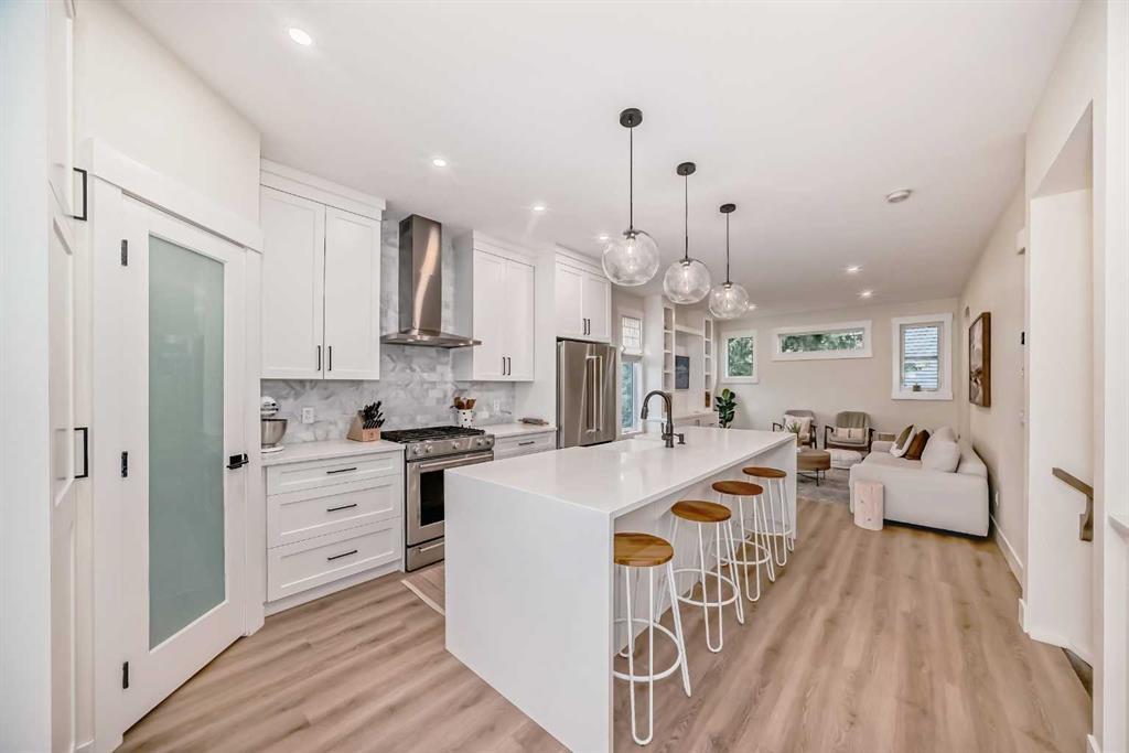 Experience luxury living just two blocks from the Bow River in this exquisite end unit residence boasting 9-foot ceilings throughout and over 2,400 square feet of developed living space. The main level impresses with high-end finishes and appliances in the gourmet kitchen, featuring a gas stove, marble backsplash, and a striking waterfall island perfect for entertaining. Step outside to the patio, complete with a gas line, ideal for enjoying morning coffees or evening fires amidst serene surroundings. Upstairs, discover three spacious bedrooms and two bathrooms, including a luxurious primary suite with a tiled shower, double sink vanity, and custom walk-in closet. The fully furnished basement offers additional living space with a bedroom, full bathroom, and a generous rec room, perfect for relaxation and entertainment. With its prime location, upscale features, and thoughtful design, this residence embodies the epitome of modern elegance. Don't miss your chance to make it yours—schedule your viewing today and experience luxury living at its finest.