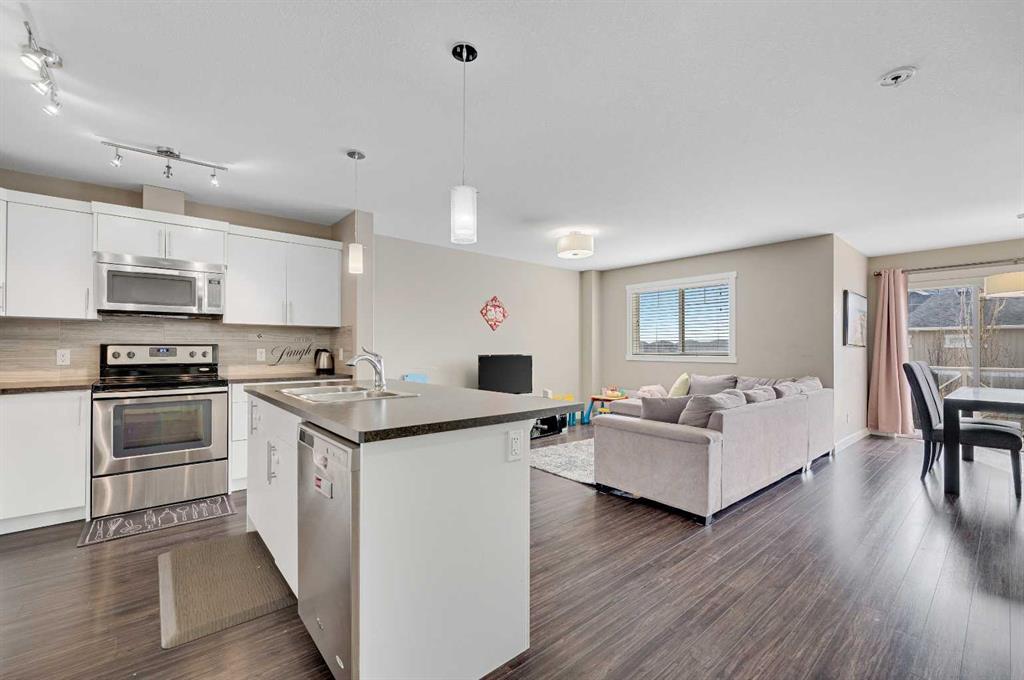 Smart Investor's or buyer's choice - Why rent when you can live here? Appointments for viewing this weekend are already being booked! This trendy 3-story townhome is ideally located in the established community of Skyview Ranch and close to the many amenities - Schools, Transit, Parks, Shopping, pathways, and FUN! This home has a single-car attached garage and a full concrete parking pad. The ground floor displays a sizeable main entrance yet is secluded from everyday living. The very spacious main floor includes beautiful laminate flooring, a stylish kitchen with upgraded tile kitchen backsplash, a modern, sleek central island with a flush eating bar and undermount stainless steel sink, classic white cabinets/doors & stainless steel appliances. A sizeable south-facing balcony off the dining room offers a BBQ deck and sitting area. Upper floor laundry area with stacked washer and dryer. BONUS: The primary bedroom layout features a private en suite bath & big walk-in closet. This trendy townhome has everything, including a functional yet stylish layout! Summer 2024 possession date available Call your friendly REALTOR(R) to book a viewing!