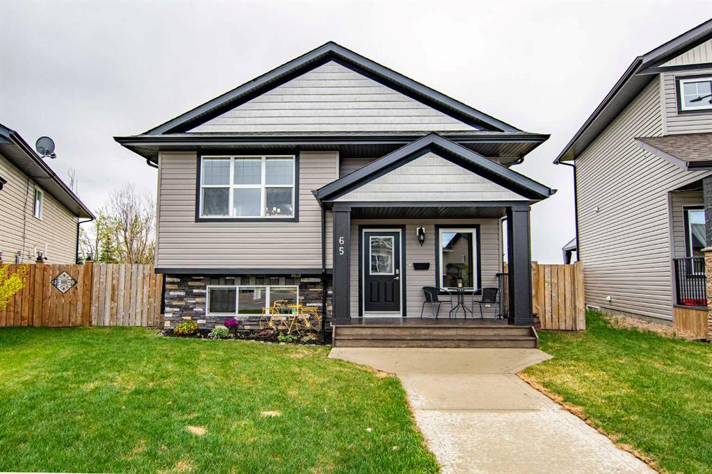Perfect Family Home in a Great Location in Blackfalds! This charming home is nestled in a peaceful crescent. The generous pie-shaped lot is bordered by a field, no neighbors to the south! Step into the beautifully landscaped yard and inviting front verandah that leads to a spacious entryway. The upper level features 9' ceilings and an open-concept layout encompassing the living room, dining area, and kitchen that opens to a covered back deck, ideal for outdoor gatherings. The well-appointed kitchen boasts rich dark maple cabinetry, stainless steel appliances, and a convenient breakfast bar. The primary bedroom is a cozy retreat with "his & her" custom closets, a ceiling fan, and 4-piece ensuite with a large vanity. Another generously sized bedroom and a main 4-piece bathroom round out this level. The lower level is the perfect place for relaxation or entertainment, featuring a sizable family room, another 4-piece bathroom, an additional bedroom, ample storage space, and in-floor heating for extra comfort. This home also offers a high-efficiency furnace, central air conditioning, a spacious fully fenced backyard with room for RV parking or a future garage, raised garden boxes, a shed, rear parking, back alley access, and impressive curb appeal. Blackfalds is conveniently located near Red Deer, offering a small-town atmosphere with easy access to schools, recreational facilities, shopping centers, and restaurants. This property combines the best of both worlds!