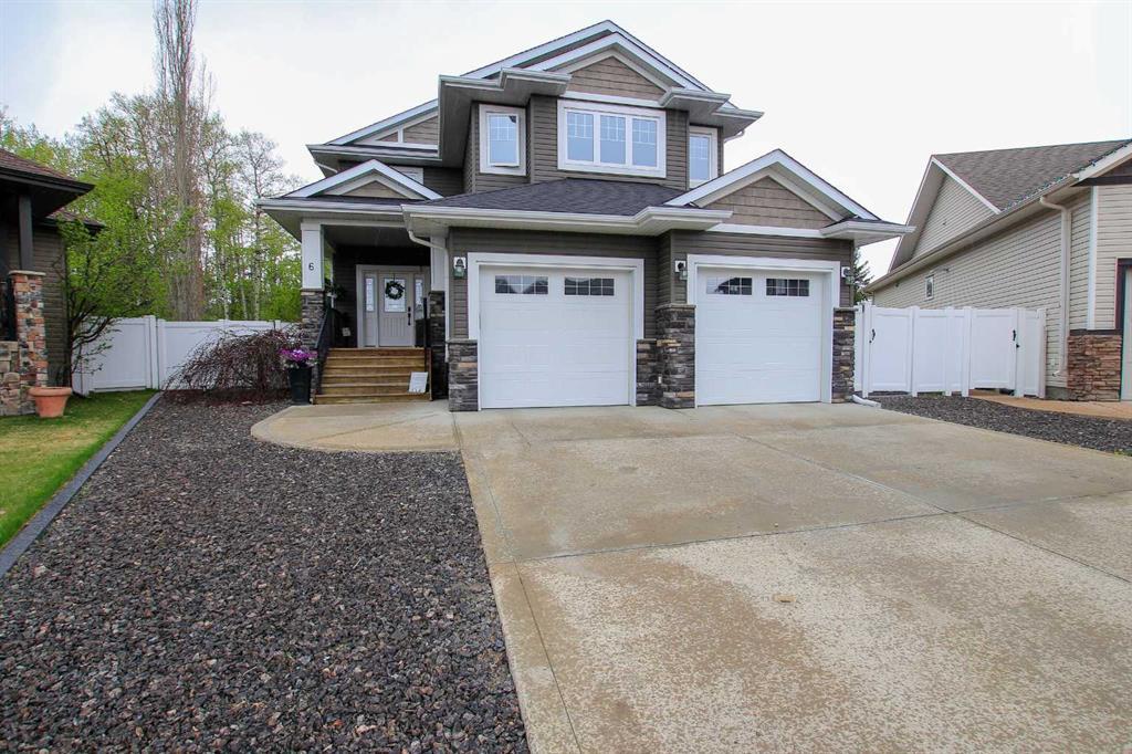 FULLY DEVELOPED 4 BED, 4 BATH CUSTOM BUILT 2-STOREY ~ TWO OVERSIZED GARAGES PLUS GATED RV PARKING ~ LARGE PIE LOT WITH NO NEIGHBOURS BEHIND ~ Pride of ownership is evident in this original owner home loaded with upgrades ~ Covered front veranda welcomes you and leads to large foyer with a built in bench and shiplap feature wall ~ Open concept main floor layout complemented by hardwood flooring and high ceilings offers a feeling of spaciousness ~ The living room features floor to ceiling windows that overlook the back yard and is centred by a cozy gas fireplace with stone accents ~ The stunning kitchen offers an abundance of dark stained cabinets, endless granite countertops including an island with an eating bar and pendant lights above, full tile backsplash, stainless steel appliances including a brand new fridge and dishwasher, more large windows overlooking the backyard, and a corner pantry ~ Easily host family gatherings in the dining room that offers garden door access to the two tiered deck and park like backyard ~ 2 piece main floor bath ~ Mud room with access to the attached garage has a built in bench ~ Open staircase leads to the upper level bonus room with vaulted ceilings, large windows, built in shelving, surround sound and another stone accented gas fireplace ~ The private primary bedroom with vaulted ceilings can easily accommodate a king size bed and furniture, has a spacious walk in closet with built in organizers and a spa like 5 piece ensuite with a corner air tub, walk in shower and granite vanity with dual sinks ~ Conveniently located laundry is just off the primary bedroom ~ 2 additional bedrooms are both a generous size and share a 4 piece bathroom ~ The basement is fully finished and features a family room ~ Other great features include; Central air conditioning, 9ft ceilings, operational in floor heat, upgraded lighting throughout, wired for sound with built in speakers, new hot water tank in 2022 ~ Double attached garage is insulated, finished with drywall, has two oversized doors and is roughed in for heat, and has a man door to a fenced in dog run ~ Heated double detached garage has 220V wiring, a man door to the backyard and overhead door to the alley ~ Gated RV parking beside the detached garage ~ The beautiful backyard oasis is overlooking mature trees, has a huge two tiered deck, multiple garden beds with crushed rock and concrete ending that are loaded with shrubs and perennials, a fire pit area, tons of yard space (room for a skating rink or pool), and access to the walking trail just behind ~ Excellent location; end of a quiet cul-de-sac, walking distance to multiple schools, parks and playgrounds, and multiple shopping plazas with all amenities.