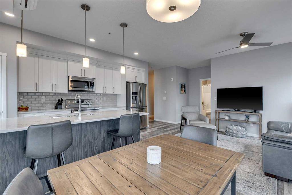 Welcome to this gorgeous corner condo, siding onto greenspace with spectacular mountain views! Your new home is full of natural light with both south and west facing views in the heart of Seton's Urban District. Enjoy your 110 sq ft wraparound deck sipping your morning coffee or entertaining with summertime barbeques, while staying cool on hot summer days with air conditioning. This stunning home features 2 bedrooms and 2 full bathrooms, an open floor plan, 9 ft ceilings, beautiful vinyl plank flooring in the main living areas, large entryway with walk-in closet, and separate laundry. The open-concept layout creates a seamless flow between the living, dining, & kitchen areas, making it perfect for entertaining guests. The modern white kitchen boasts sleek quartz countertops, stainless steel appliances, pantry, and an abundance of cabinet space. A generous sized dining room, surrounded by windows and mountain views, leads out to your balcony. When it's time to relax, make your way to the large primary bedroom, complimented by an impressive 4-piece ensuite with dual vanities and walk-in shower. Through the ensuite you'll find a generous sized walk-in closet. The second bedroom is located on the opposite side of the unit allowing for privacy and is next to the four-piece main bathroom with a soaker tub. The two titled underground parking stalls are a huge bonus with this home along with an assigned storage locker, bike storage, and ample underground visitor parking. Unbeatable location, within walking distance to all amenities including shopping, restaurants, South Health Campus Hospital, YMCA, VIP Cineplex movie theatre, and so much more! Pet friendly complex with a maximum of two pets per home with board approval.