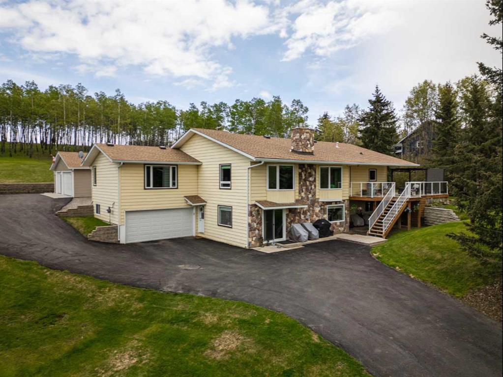 Acreage living only 15 minutes from the city this acreage is perfectly situated on 2.03 acres of perfectly manicured yard with mature trees (including cottonwood, spruce, lilac, willow, and choke cherrys) offering privacy and tranquility. The nature continues with this property in the wildlife seen in the area including owls, deer, moose, coyotes and foxes! You can drive on pavement right up to your sprawling walkout bungalow with an attached garage or head up to the triple detached garage where you've got plenty of space for projects and parking for your RV or travel trailer.This property offers great quality water through the local water co-op. Inside the house you've over 3,900 sq ft of usable space between 2 levels - starting upstairs you've got a large front entry flanked by a large living room complete with a valor gas fireplace and formal dining room which leads into your large Kitchen with quartz counters, hickory hardwood cabinets and stainless steel appliances with patio doors leading to your massive wrap around deck and patio space where you can relax and enjoy the sun throughout the day. The main floor has a rear porch laundry room with separate 1 pc bath, an open office off the kitchen, 2 large secondary bedrooms and a 5 PC bath with double vanity and heated tile floors. The primary retreat is 18' x 20'8" with lots of windows, 2 large closets and 3 PC ensuite with large vanity, vessel sink and heated tile floors. The basement is a beautiful walkout with large windows for natural light a huge rec room with an electric fireplace, full country kitchen and full 4 PC Bath as well as another large bedroom and plenty of storage. This one is move in ready with many updates over the last 10 years including flooring, roofing, windows, hot water tank, furnaces, bathroom fixtures. Book a showing, move in and enjoy the wildlife, privacy and tranquility of White Post Lane!
