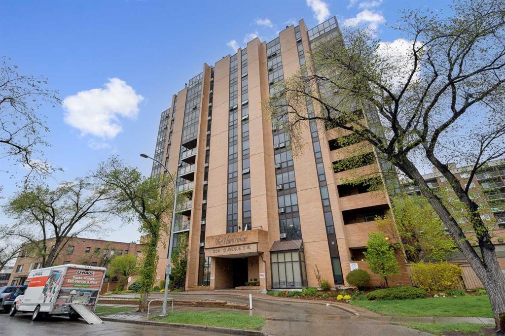 Experience the best of city living in this spacious 2-bedroom, 1-bathroom + Sunroom located on the 9th floor of a well-maintained building. Upon entering you know The Huntsman is special, the lobby is modern and stunning and there are 2-elevators to whisk you up to your home. This corner location offers open, panoramic views through the large windows, allowing plenty of natural light to flood the space. The kitchen, dining and living space are all open concept. The modern farmhouse kitchen has tiled floors that looks like concrete, oak cabinets with black hardware, the stainless steel appliances are newer and the black kitchen faucet was just installed. The bedrooms are on opposite sides of this home allowing for separation and privacy for guests. The primary bedroom has a walk through closet which connects to the 4-piece bathroom where you'll find a linen closet to help keep you organized. Stylish and durable laminate floors have been installed throughout this home (no carpet here) these floors add a warm and refined feel. The sunroom is an additional 100-square feet and provides an awesome flex space with tonnes of natural light. How would you use it: an indoor garden, a reading or meditation room...this space is over 13-feet long providing you countless options. In addition to the modern lobby and dual elevators, The Huntsman offers underground parking, garbage chute, bike room, storage locker, fitness centre, rooftop patio(2nd floor), gardens & a pickleball/tennis court. Don't miss out on this incredible opportunity to enjoy city living at it's finest as you're within a 5-block radius of the C-Train, 17th Ave, Co-Op for groceries and walking paths along the Bow River...this is the perfect place to call home.