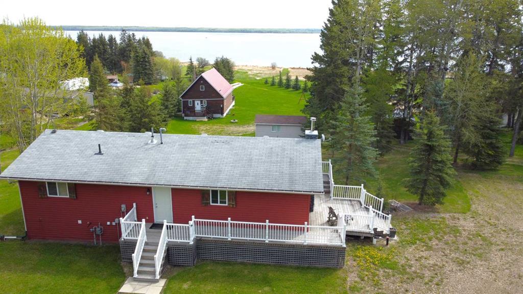 A RARE GEM -Attractive home offering 2 suites with separate entrances both with a LAKE VIEW both ready to enjoy. The inviting main floor kitchen/dining/living area has plenty of cabinetry, pantry and has a gas hook up to add a fireplace. Upstairs you will also find 3 bedrooms, 4 piece bathroom, laundry room and access to the deck wrapped around 3 sides. The stylish walkout basement boasts open concept living with 9' ceilings, large windows, woodburning fireplace, kitchen with plenty of wood cabinets, pantry, breakfast bar and large dining area. 2 more good sized bedrooms, 3 piece bathroom, TV room with French doors, spacious entryway and a space plumbed for a second laundry complete the lower level. Massive lower deck is a great entertainment area with a stacked stone BBQ/Bar area, low maintenance yard with mature trees adding to the privacy. All this and store your toys in the oversized 32x28 ft. garage! Municipal Reserve runs along side of the property giving you direct access to the lake and dock. Perfect location, half acre pie shaped lot in a quiet culdesac, one row off lakefront, short walk to shops, and a great fishing lake.