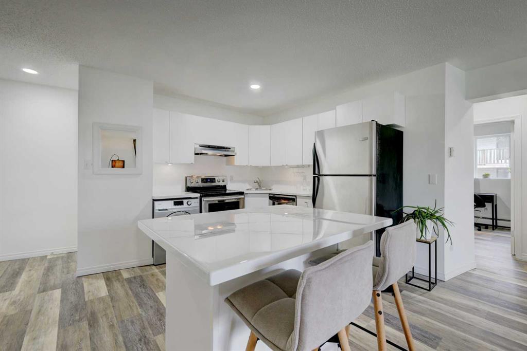 Don’t miss this Beautiful condo in the sought-after Bankview community This 2 bedroom corner unit offers a bright, spacious, open concept living space with recent upgrades to provide a modern, Zen-like feel. Vinyl plank flooring throughout gives this home a cohesive look. The kitchen has a centre island. white cabinetry and new epoxy countertops that give the kitchen a stylish look that you will love. Stainless appliances include a fridge, built-in dishwasher, stove and in-suite laundry with the European washer/dryer combo. The spacious living room has large patio doors that bring in a ton of natural light and Pot lights throughout that enhance the natural light that flows in. You will really enjoy the large, south-facing deck for your morning coffee or evening wind-down. The primary bedroom has a large closet and could easily accommodate a king bed. The second bedroom can be used as a flex room/office/sitting room – the choice is yours. There is a conveniently located assigned parking stall, an assigned storage locker, mail pick up on the main level, all in a very well-maintained building located on a quiet street. Bankview offers a vibrant urban lifestyle with a blend of modern conveniences and charming neighborhood character, known for its stunning city views, proximity to the downtown core and several public transit options. If you like greenspace, we have it in spades, with parks, off-leash areas, playgrounds and the recently upgraded Buckmaster Park which is minutes away, where you can enjoy sports and community activities. You will quickly feel at home in this wonderful community that offers so much to everyone. The Bankview Community Association is dedicated to fostering a vibrant and inclusive community to its residents. And you are so close to 17 Ave with its eclectic mix of coffee shops, restaurants, pubs and shopping boutiques. Don’t miss your opportunity to live in one of the best neighborhoods in Calgary!
