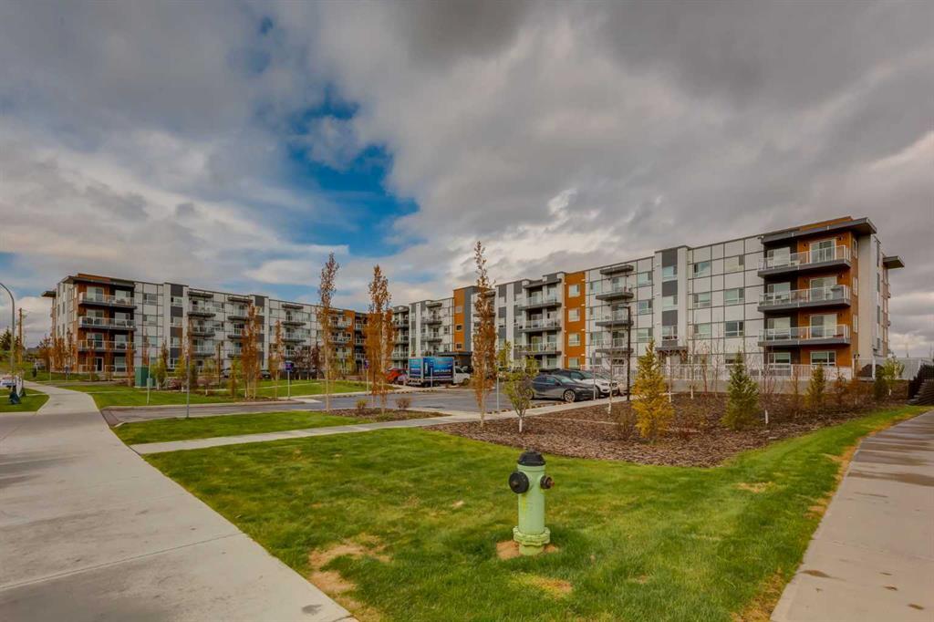Maintenance free living at its finest in this meticulously cared for TOP FLOOR 2 bedroom condo nestled in the Parks of Harvest Hills. Luxurious finishes throughout featuring vinyl plank and tile flooring, barn door, chic light fixtures and an open floor plan with a stunning kitchen equipped with dual toned cabinetry, quartz countertops, stainless steel appliances, pantry and incredible center island with eating bar transitions to the living room with access to the SOUTH facing balcony. The spacious master bedroom offers a 4 piece ensuite bathroom with dual sinks complete with a standing shower and a walk-in closet. A second bedroom, 4 piece bathroom and generously scaled laundry/storage room complete this unit. Don't overlook the AC, TWO TITLED PARKING STALLS (one underground, one above ground) and additional storage cage. Beyond the confines of your home, discover a vibrant community loaded with amenities (restaurants, shopping, rec center), a network of pathways as well as close proximity to schools, parks and public transit. Plus, enjoy the convenience of being under 10 minutes away from the Calgary International Airport. Don't miss out on the opportunity to call this modern condo your home!