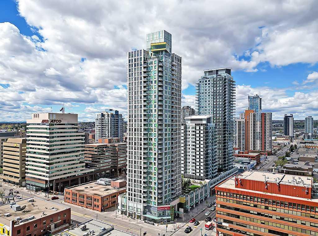 Welcome to Mark on 10th! Located in the heart of the Beltline, this unit offers luxury living and unmatched walkability with quick access to the C-Train, shops, restaurants, downtown, 17th Ave and the Bow River pathway system! This stunning northeast facing unit features 2 beds + den, 2 baths, and over 902 SqFt of living space. It also comes with AC, a titled underground parking stall and a storage locker! Recent upgrades to the home include brand new laminate floors, fresh paint, and other minor touch ups/repairs throughout the home. When you enter the home you are greeted with a large entryway. You’ll find a 4-piece bathroom adjacent to the entrance as well as your stacked laundry in the front hall closet. The well appointed kitchen features top end stainless steel appliances, quartz countertops, and loads of cabinetry. As you move into the open concept living space, the floor to ceiling windows reveal downtown views of Calgary’s skyline and a large northeast facing balcony. The living/dining spaces are generously sized making it perfect to entertain family and friends! You’ll find the bedrooms are well separated on either side of the living space providing extra privacy. The primary suite has a large walk-in closet and well designed 3-piece ensuite. The second bedroom is well sized and there is a den with an elegant sliding glass door adjacent to the bedroom making it perfect for a home office! Mark on 10th has fantastic building amenities including a fitness center, sauna, spa/hot tub, a party room and rentable guest suites. With a Safeway grocery store steps away and endless amenities within blocks, Mark on 10th is the ultimate urban living!