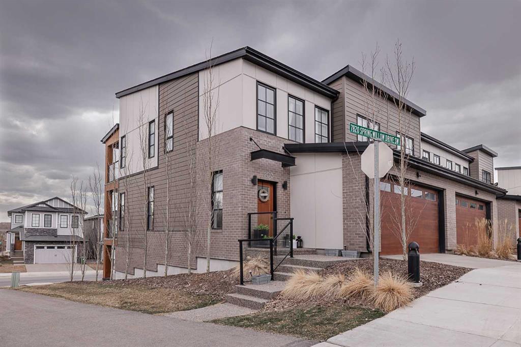 Welcome to this sunny and stunning end unit townhouse that boasts over 2300 sq ft and an open design layout flooded with natural light and a partial mountain view due to the expansive west-facing windows. This home offers upgrades galore to enjoy the finer things with metal railings, a sleek gas range, quartz countertops, custom paneled built-in fridge, garage heating, and central air conditioning. The main floor unfolds with a captivating open layout, inviting you to experience the epitome of modern living. The kitchen is both functional and stylish, making meal preparation a delight. Discover three spacious bedrooms upstairs, each with its own walk-in closet. Luxurious touches include vaulted ceilings which add an airy feel, while the gorgeous ensuite features a drop-in tub, LED backlit mirrors and a fully tiled shower. Also enjoy a conveniently located upstairs laundry room. The walkout basement offers a full bathroom, a generous bedroom, and a bright living area—perfect for guests or as a cozy retreat. With 3 west-facing decks and a green space, this townhouse offers both indoor luxury and outdoor tranquility in a quiet part of one of the best neighbourhoods Calgary has to offer. Don't miss your chance to call this gem home!